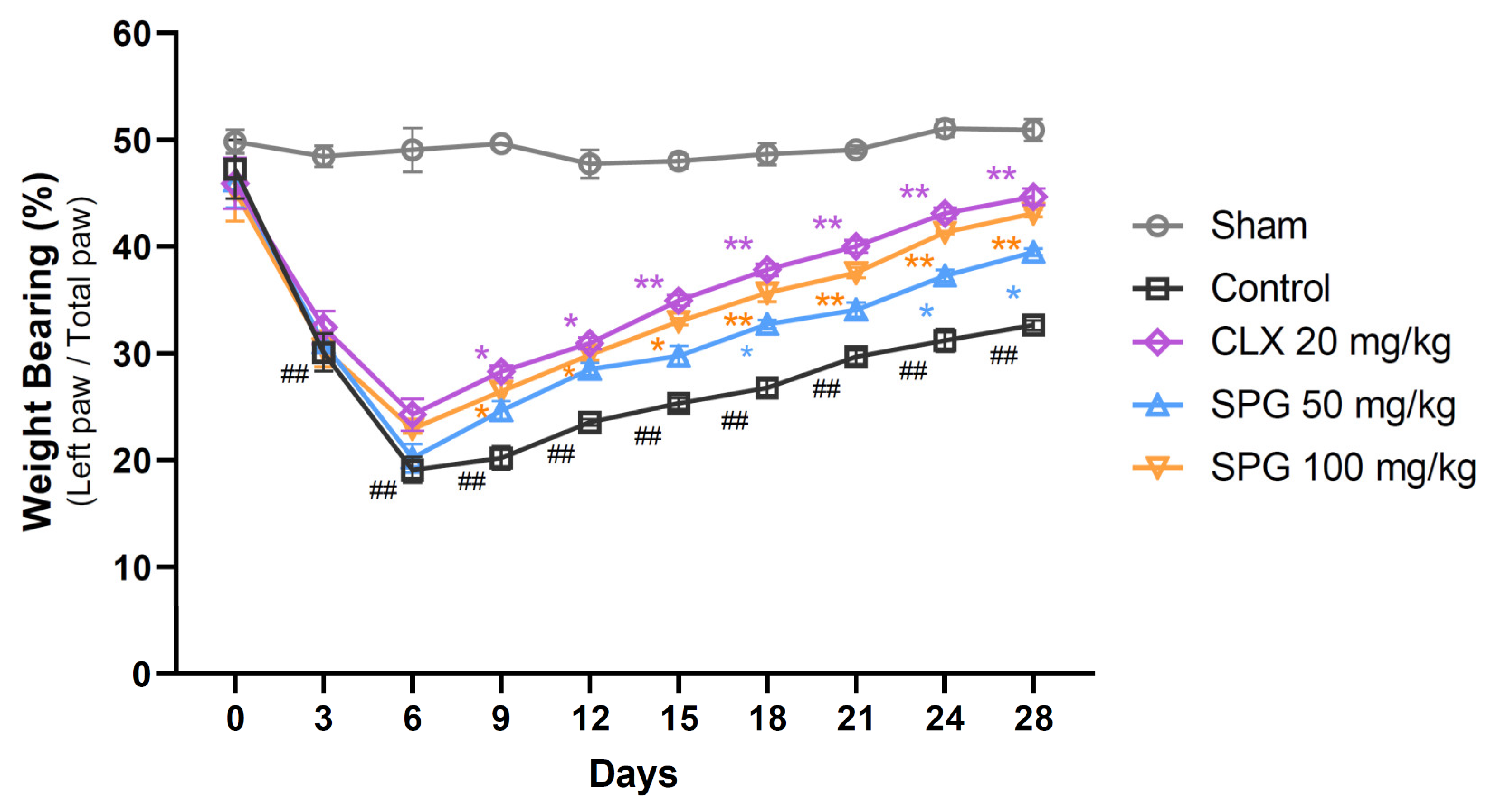 Figure 2). Quantification of nociception confirmed that the Sham group maintained an equitable load distribution throughout the observation period. In sharp contrast, the Control group exhibited a marked, persistent reduction in the weight supported by the ipsilateral (OA-affected) hind limb compared to the Sham animals over the entire study duration. Significantly, all active treatment groups (CLX 20 mg/kg, SPG 50 mg/kg, and SPG 100 mg/kg) displayed enhanced weight-bearing capability when compared to the Control group. Specifically, the high-dose SPG group (100 mg/kg) demonstrated significant recovery from Day 9 post-OA induction, reaching an efficacy level comparable to that of the positive comparator, CLX. These findings strongly indicate that the oral administration of SPG is effective in reducing joint pain in mice challenged with MIA-induced OA.