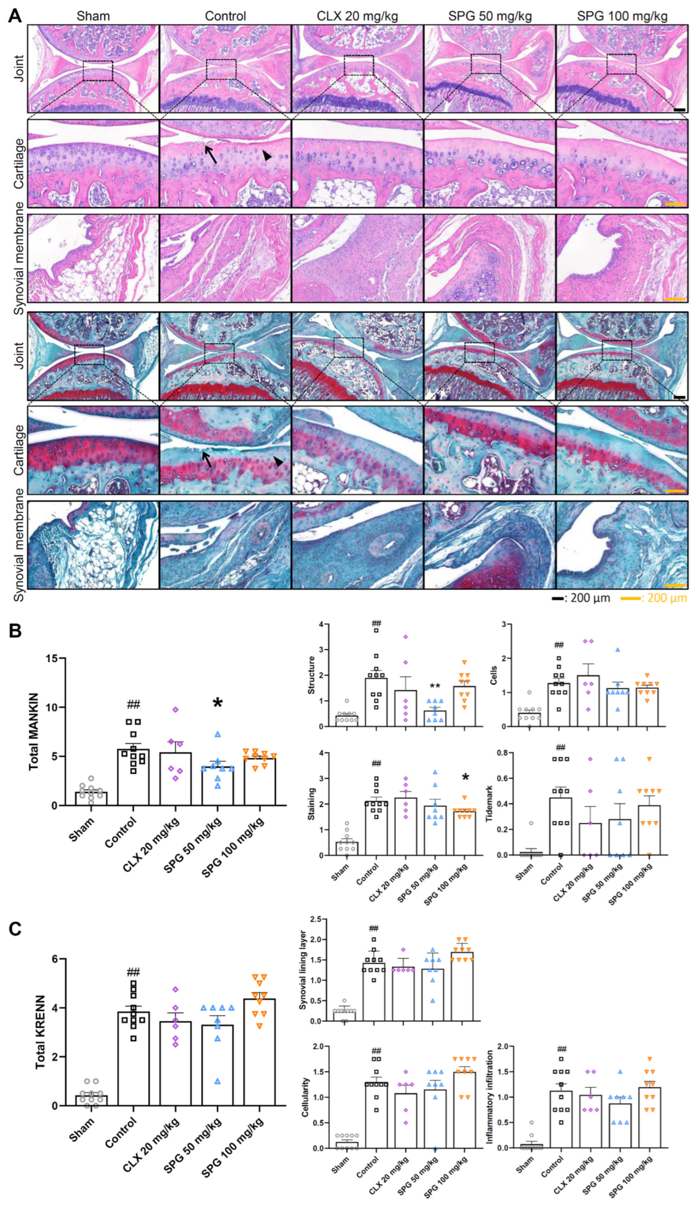 The chondroprotective efficacy of SPG was further validated by the maintenance of cartilage matrix structure and lower Mankin scores (