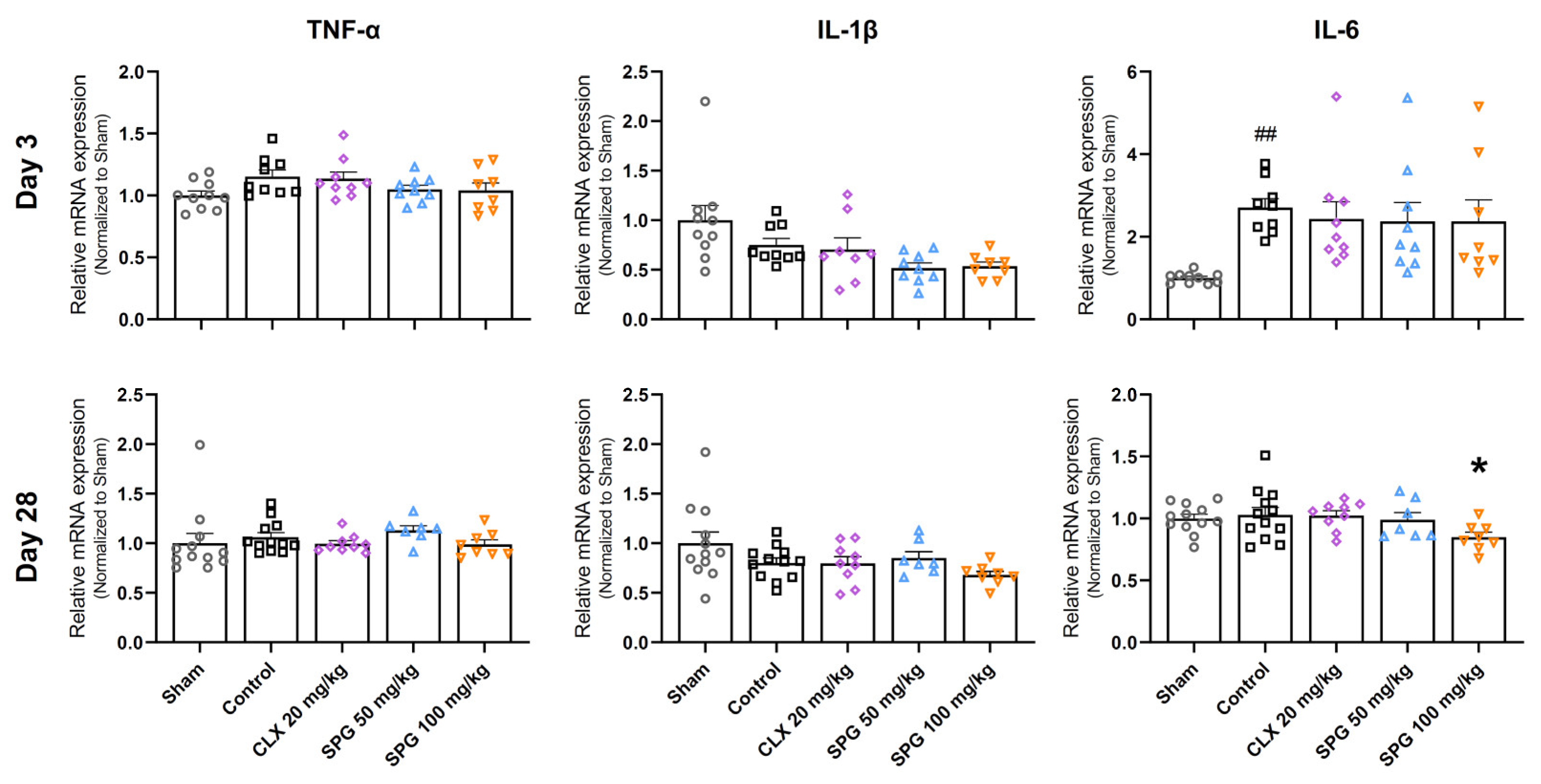 Figure 4). The inflammatory status was relatively quiescent at Day 3 post-OA induction, which marks the early phase of the disease. During this early phase, only IL-6 mRNA expression was found to be significantly elevated in the Control group compared to the Sham group. Furthermore, no significant alterations were detected in the transcription levels of TNF-α or IL-1β at this specific time point. Although a numerical trend showing reduced IL-6 expression was observed across all three active treatment arms (CLX 20 mg/kg, SPG 50 mg/kg, SPG 100 mg/kg), these differences did not achieve statistical significance relative to the Control group. By Day 28, representing the advanced OA stage, the overall inflammatory profile appeared to subside across all groups, with no significant differences identifiable for most markers examined. Notwithstanding this general subsidence, the high-dose SPG group (SPG 100 mg/kg) specifically exhibited a statistically significant attenuation of IL-6 mRNA expression when contrasted with the Control group. In summation, these outcomes suggest that the ability of oral SPG administration to broadly suppress the expression of pro-inflammatory cytokines within the cartilage is limited. The singular, notable exception was the specific and significant IL-6 gene reduction documented at the high-dose of SPG during the late stage of OA progression.
