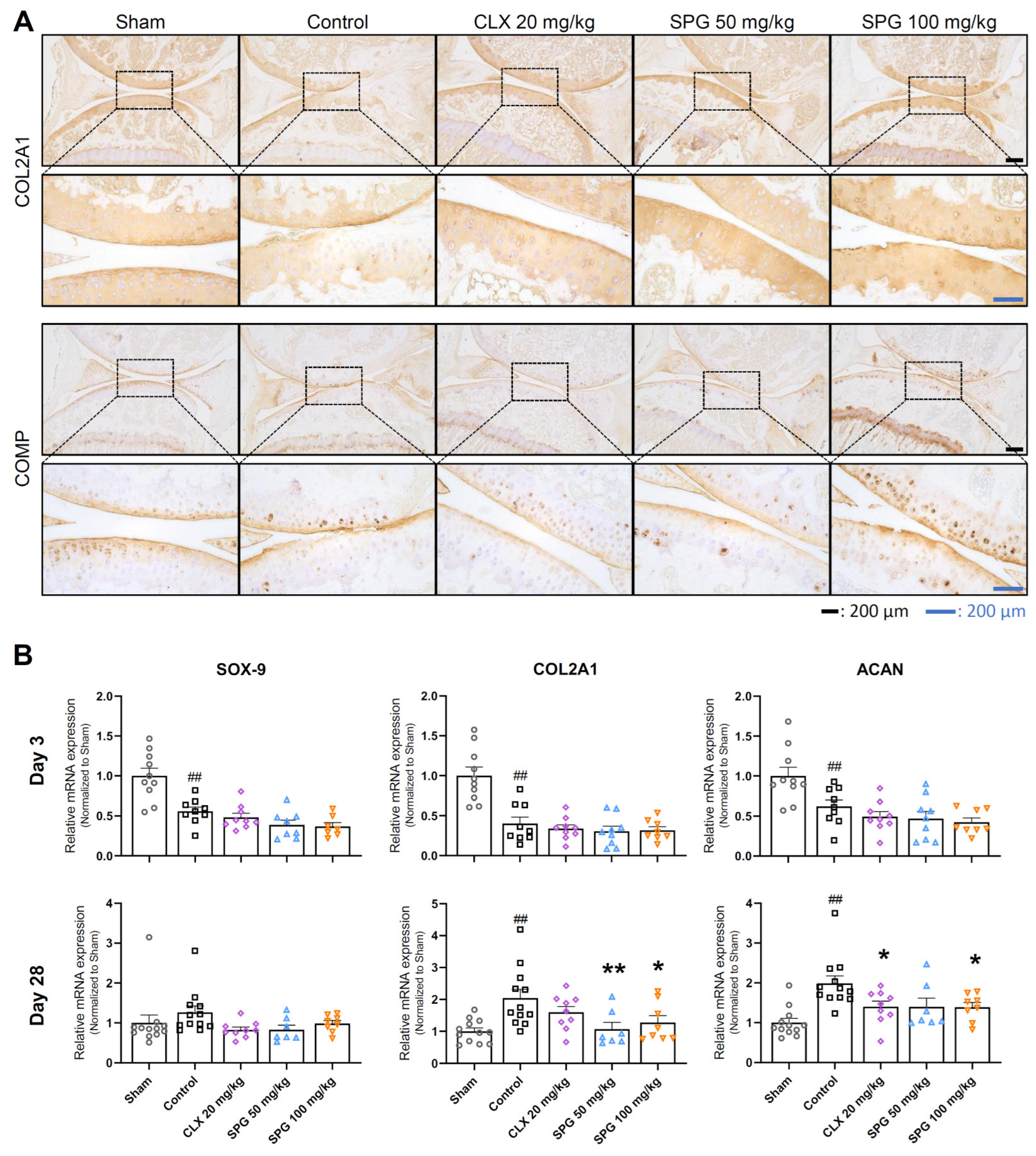 Figure 5B, upper panels). By Day 28, this expression pattern was dramatically reversed. At this late stage, the Control group showed significantly elevated mRNA expression levels of SOX-9, COL2A1, and ACAN compared to the Sham group. This increase likely reflects a robust, albeit ultimately inadequate, compensatory anabolic response to severe matrix loss. In striking contrast, the CLX- and SPG-treated groups showed an attenuated need for such homeostatic upregulation, maintaining markedly lower mRNA levels of these markers than the Control group. Specifically, COL2A1 transcription was significantly lower in both the SPG 50 and 100 mg/kg groups. Additionally, ACAN expression was significantly suppressed in the CLX 20 mg/kg and SPG 100 mg/kg groups compared to the Control group (