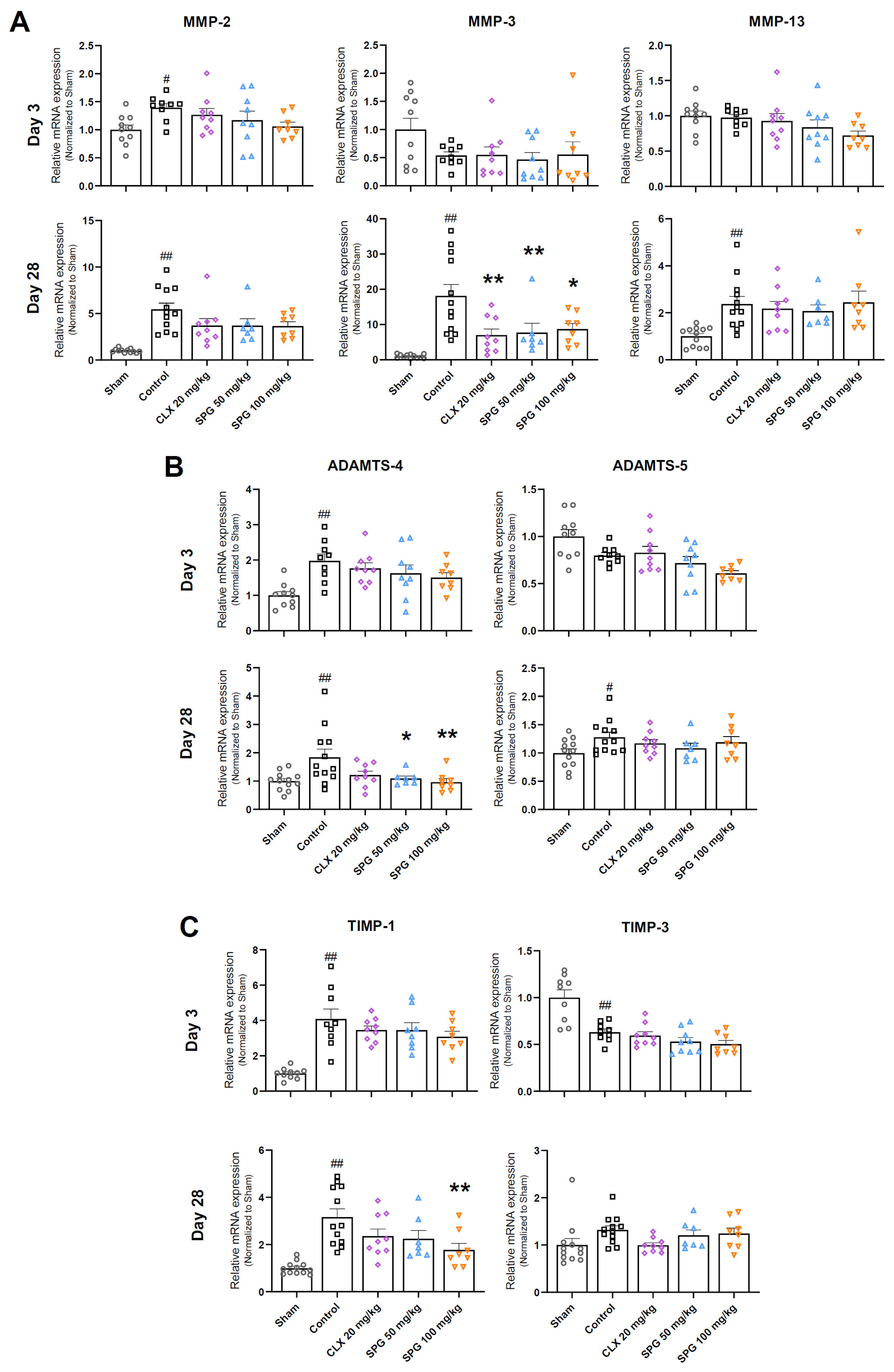 Figure 6B, right upper panel). By day 28 post-OA induction, the changes in enzyme expression became more pronounced. The transcription of MMP-2, MMP-3, MMP-13, ADAMTS-4, and ADAMTS-5 was significantly upregulated in the Control group relative to the Sham group. Notably, treatment with CLX and both doses of SPG (50 and 100 mg/kg) reduced the mRNA levels of MMP-2, MMP-3, and ADAMTS-4 compared to the Control group. Specifically, MMP-3 expression was significantly downregulated across all treatment groups. Furthermore, both the SPG 50 and 100 mg/kg groups showed a significant decrease in ADAMTS-4 levels relative to the Control group. In contrast, no statistically significant differences were observed in MMP-13 and ADAMTS-5 expression between the Control group and the treated groups at this stage (