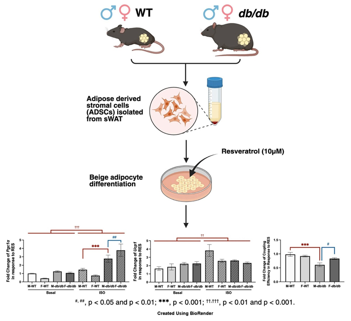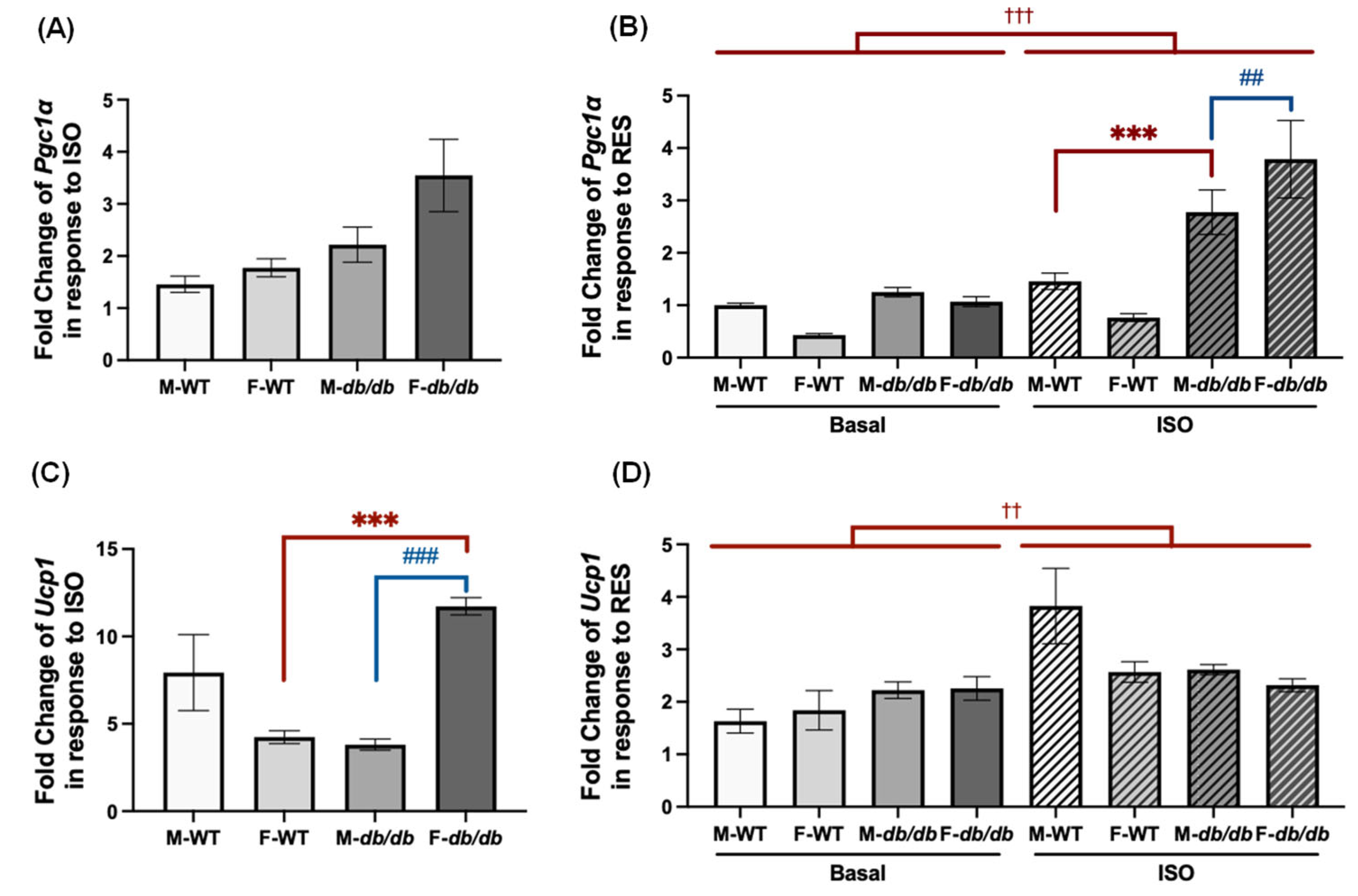 Fold changes in thermogenic gene expression following ISO and RES treatment in the adipocytes derived from ADSCs of male and female WT and db/db mice. (A) Fold Changes in Pgc1α and (C) Ucp1 mRNA expression in response to ISO stimulation were calculated for all groups. (B) Fold Changes in Pgc1α and (D) Ucp1 mRNA expression in response to RES relative to the DMSO were calculated under basal or ISO-stimulated conditions. Data are shown as mean ± SEM (n = 3). One-way ANOVA was used for statistical analysis in (A,C); two-way ANOVA was used in (B,D). ##, ### indicate p < 0.01 and p < 0.001 for comparisons between males and females. *** indicates p < 0.001 for comparisons between WT and db/db mice. ††, ††† indicate p < 0.01 and p < 0.001 for comparisons between basal and ISO conditions.