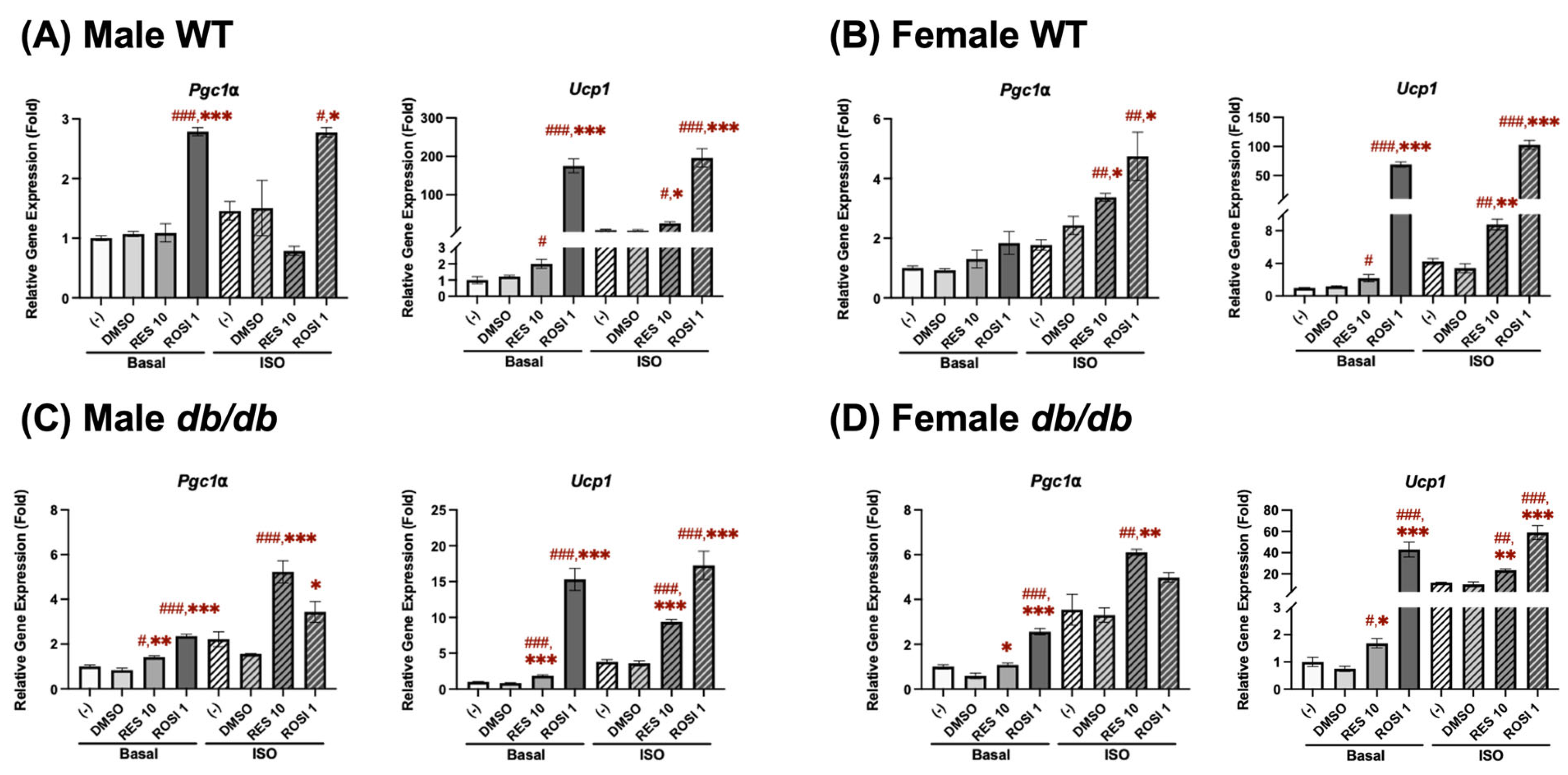 RES induced browning by increasing Pgc1α and Ucp1 mRNA expression in the differentiated ADSCs derived from (A) male WT, (B) female WT, (C) male db/db, and (D) female db/db mice. The ADSCs were isolated from subcutaneous white adipose tissue in mice aged 10–12 weeks. Pgc1α and Ucp1 mRNA expression was measured in pooled ADSCs from 3 to 5 mice following 7-day differentiation in the presence or absence of either resveratrol (RES, 10 µM), rosiglitazone (ROSI, a positive control, 1 µM), or the vehicle control (DMSO). Isoproterenol (ISO, 1 µM) was added for the final 6 h to activate brown-like adipocytes. Data are shown as mean ± SEM (n = 3). One-way ANOVA was used for all statistical analyses in basal or ISO-stimulated conditions. #, ##, and ### indicate p < 0.05, p < 0.01, and p < 0.001, respectively, compared to the negative control (−) group, while *, **, and *** indicate p < 0.05, p < 0.01, and p < 0.001, respectively, compared to the DMSO group.