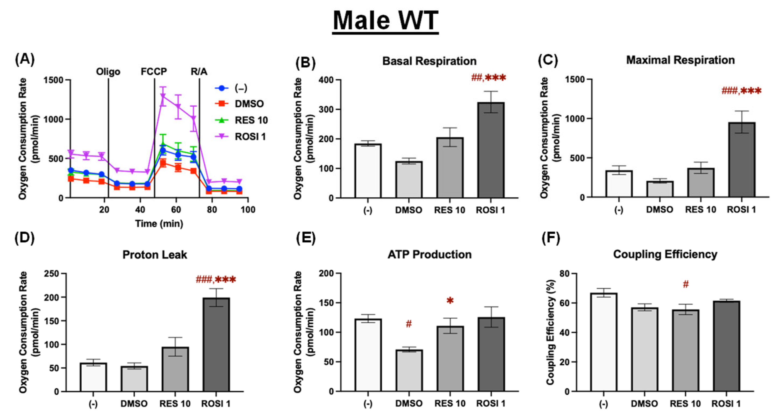 RES enhanced mitochondrial uncoupling in the differentiated ADSCs from female WT mice. The ADSCs were first differentiated in the presence or absence of RES (10 µM), ROSI (1 µM), or DMSO for 7 days, then were reseeded into a Seahorse XFe assay plate. The cells underwent real-time oxygen consumption rate (OCR) measurements for a mitochondrial stress test after reseeding. (A) OCR recordings over time, (B) basal respiration, (C) maximal respiration, (D) proton leak, (E) ATP production, and (F) coupling efficiency are shown. Data are shown as mean ± SEM (n = 3–5). One-way ANOVA was used for statistical analysis. #, ##, and ### indicate p < 0.05, p < 0.01, and p < 0.001, respectively, compared to the (−) group, while *, ** indicate p < 0.05 and p < 0.01 compared to the DMSO group.