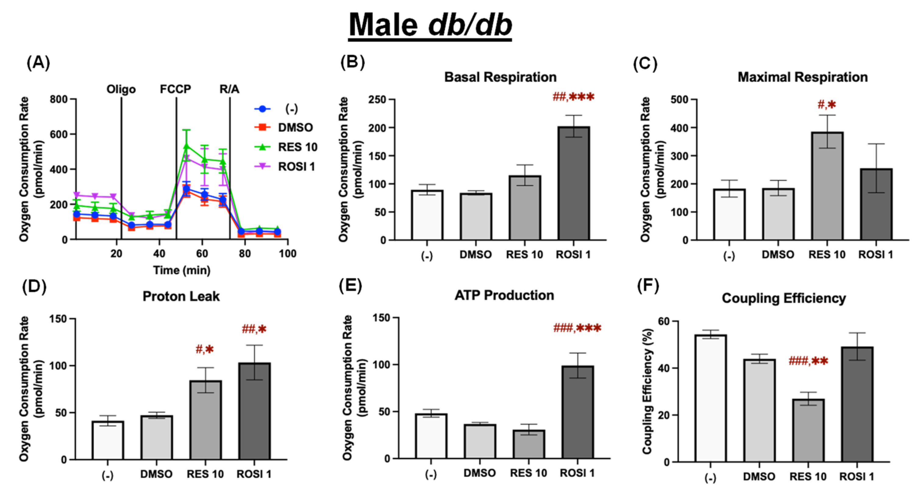 RES enhanced mitochondrial uncoupling in the differentiated ADSCs from male db/db mice. The ADSCs were first differentiated in the presence or absence of RES (10 µM), ROSI (1 µM), or DMSO for 7 days, then were reseeded into a Seahorse XFe assay plate. The cells underwent real-time oxygen consumption rate (OCR) measurements for a mitochondrial stress test after reseeding. (A) OCR recordings over time, (B) basal respiration, (C) maximal respiration, (D) proton leak, (E) ATP production, and (F) coupling efficiency are shown. Data are shown as mean ± SEM (n = 3–5). One-way ANOVA was used for statistical analysis. #, ##, and ### indicate p < 0.05, p < 0.01, and p < 0.001, respectively, compared to the (−) group, while *, **, and *** indicate p < 0.05, p < 0.01, and p < 0.001, respectively, compared to the DMSO group.