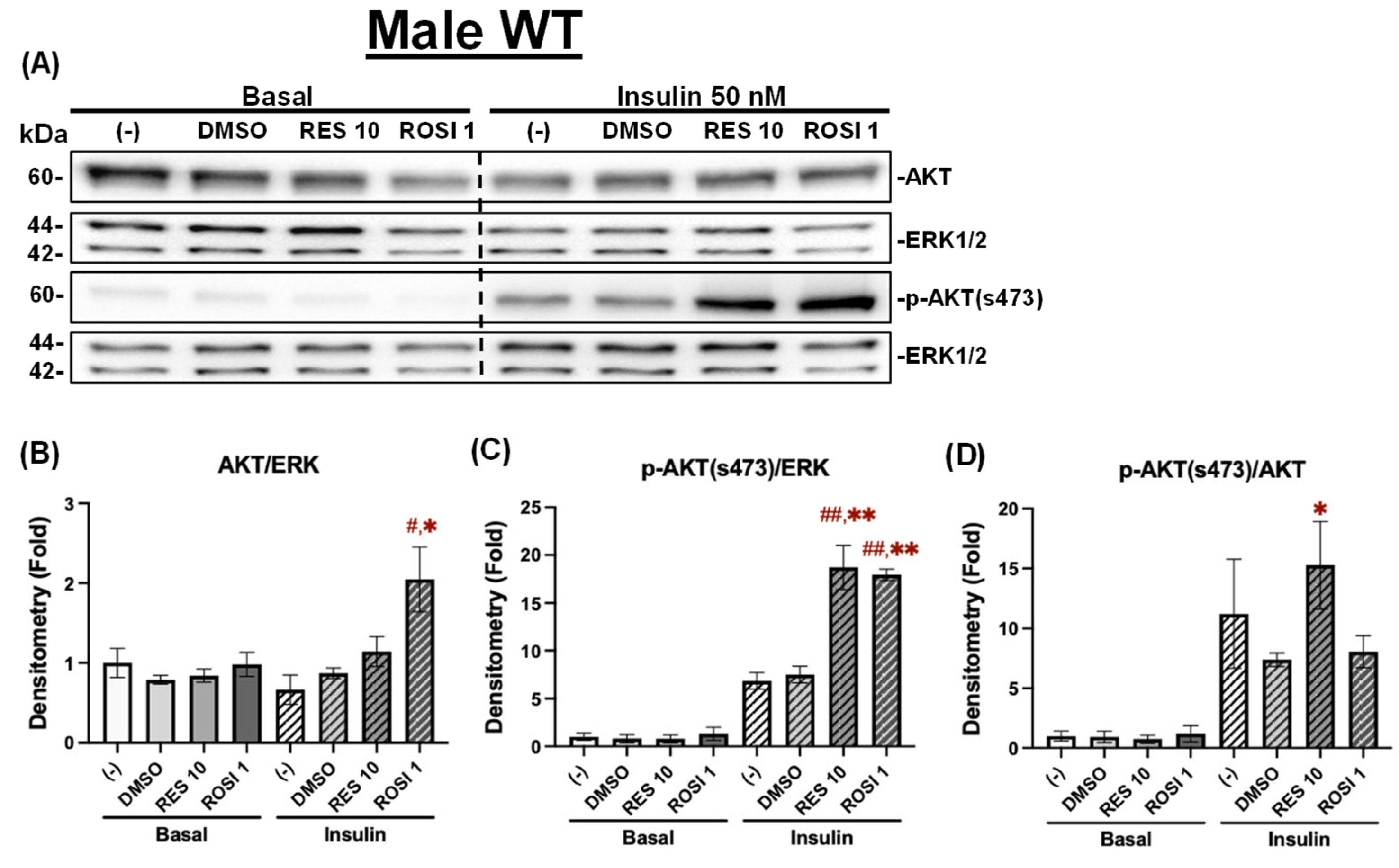 RES improved insulin signaling in the differentiated ADSCs from male WT mice. The ADSCs from the male WT mice were differentiated for 7 days in the presence or absence of RES (10 µM), ROSI (a positive control, 1 μM), or DMSO, followed by overnight starvation in DMEM/high glucose without FBS. Cells were then stimulated with or without insulin (50 nM) for 20 min, and protein lysates were collected for Western blot analysis. (A) Total AKT, p-AKT (ser473), and their respective loading control ERK1/2 are shown. The left panel corresponds to the basal condition (−Insulin), and the right panel to the insulin-stimulated condition (+Insulin). Quantifications of total AKT/ERK1/2 (B), p-AKT/ERK1/2 (C), and p-AKT/total AKT (D) are presented as fold changes relative to the (−) group under basal conditions. Data are shown as mean ± SEM (n = 3). One-way ANOVA was used for statistical analysis. # and ## indicate p < 0.05 and p < 0.01 compared to the (−) group. * and ** indicate p < 0.05 and p < 0.01 compared to the DMSO group.