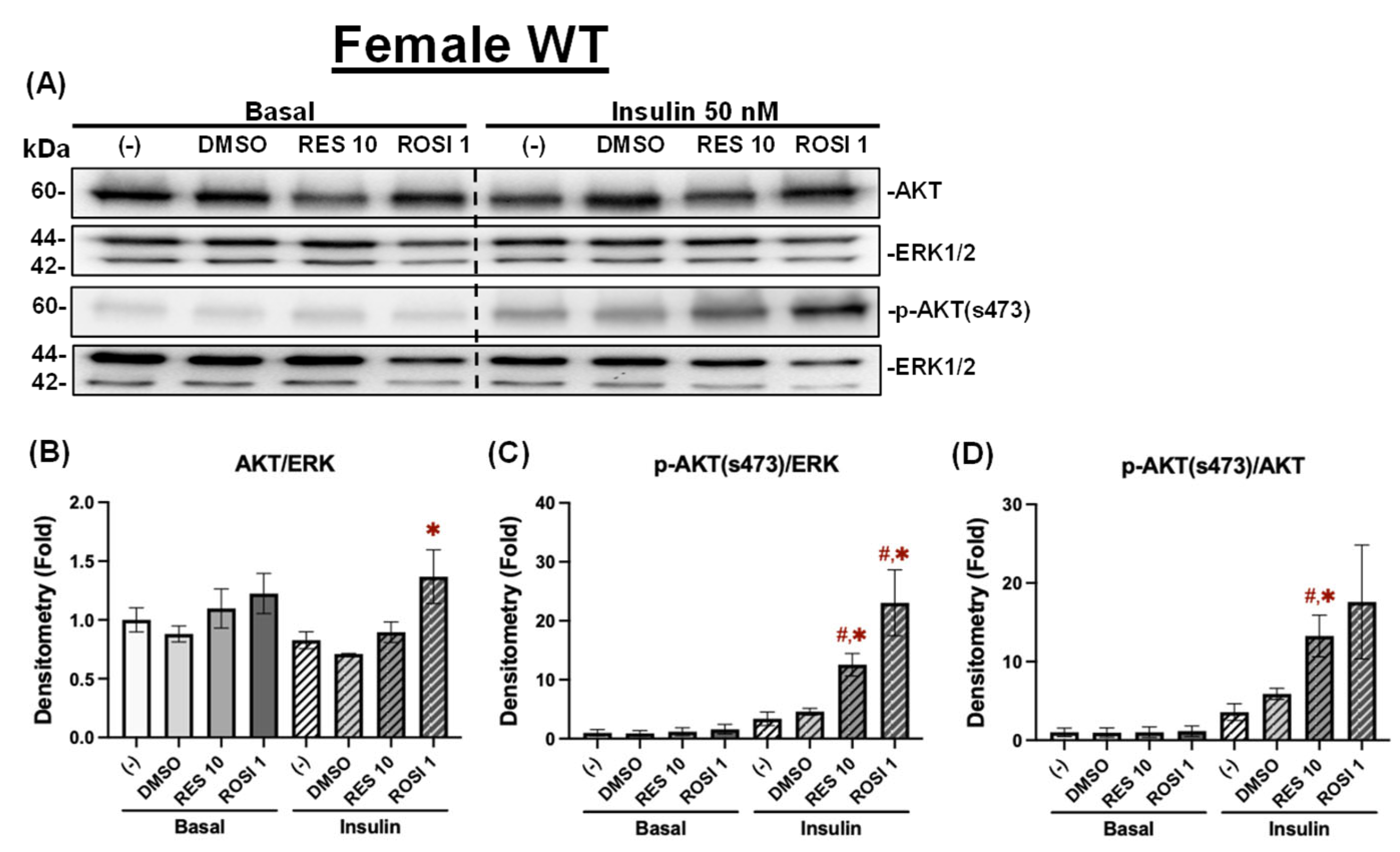 RES improved insulin signaling in the differentiated ADSCs from female WT mice. The ADSCs from the female WT mice were differentiated for 7 days in the presence or absence of RES (10 µM), ROSI (a positive control, 1 μM), or DMSO, followed by overnight starvation in DMEM/high glucose without FBS. Cells were then stimulated with or without insulin (50 nM) for 20 min, and protein lysates were collected for Western blot analysis. (A) Total AKT, p-AKT (ser473), and their respective loading control ERK1/2 are shown. The left panel corresponds to the basal condition (−Insulin), and the right panel to the insulin-stimulated condition (+Insulin). Quantifications of total AKT/ERK1/2 (B), p-AKT/ERK1/2 (C), and p-AKT/total AKT (D) are presented as fold changes relative to the (−) group under basal conditions. Data are shown as mean ± SEM (n = 3). One-way ANOVA was used for statistical analysis. # indicates p < 0.05 compared to the (−) group. * indicates p < 0.05 compared to the DMSO group.