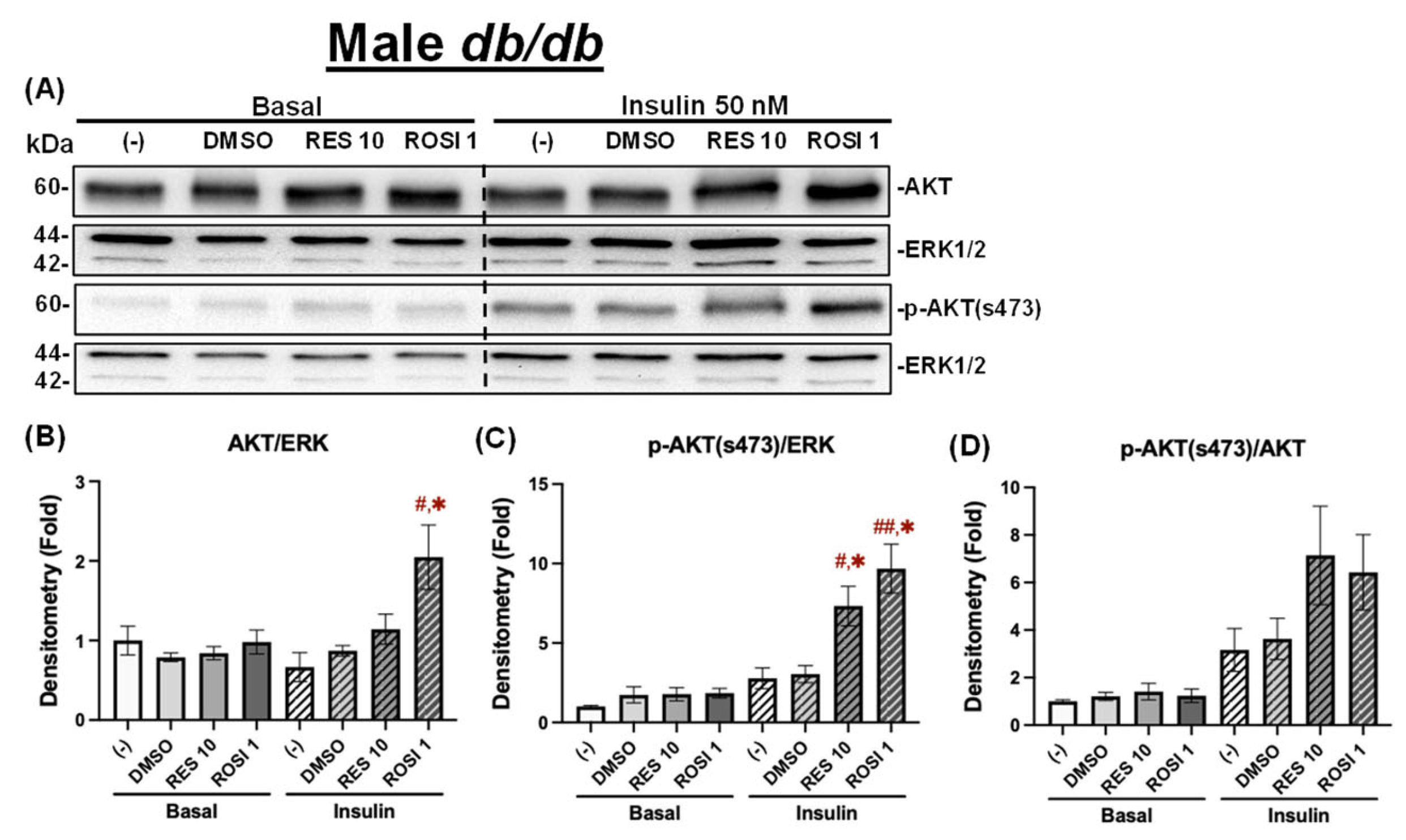 The effects of RES on insulin signaling in the differentiated ADSCs from male db/db mice. The ADSCs from male db/db mice were differentiated for 7 days in the presence or absence of RES (10 µM), ROSI (a positive control, 1 μM), or DMSO, followed by overnight starvation in DMEM/high glucose without FBS. Cells were then stimulated with or without insulin (50 nM) for 20 min. Protein lysates were collected for Western blot analysis. (A) Total AKT, p-AKT (ser473), and their respective loading control ERK1/2 are shown. The left panel represents the basal condition (−Insulin), and the right panel shows the insulin-stimulated condition (+Insulin). Quantifications of total AKT/ERK1/2 (B), p-AKT/ERK1/2 (C), and p-AKT/total AKT (D) are presented as fold changes relative to the (−) group under basal conditions. Data are shown as mean ± SEM (n = 3). One-way ANOVA was used for statistical analysis. # and ## indicate p < 0.05 and p < 0.01 compared to the (−) group. * indicates p < 0.05 compared to the DMSO group.