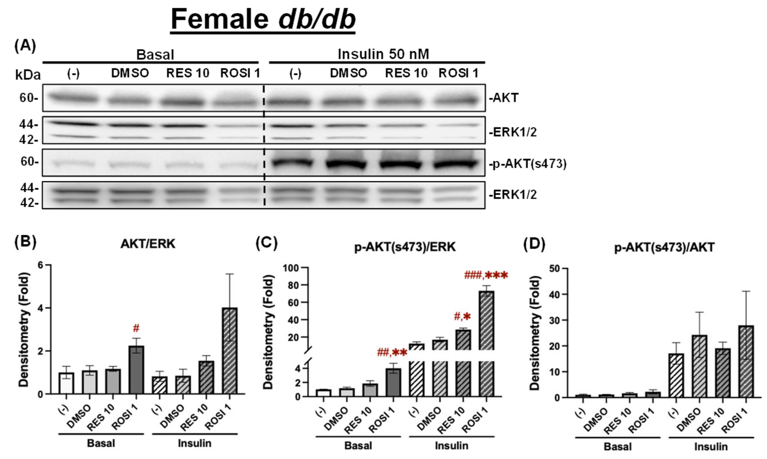 The effects of RES on insulin signaling in the differentiated ADSCs from female db/db mice. The ADSCs from the female db/db mice were differentiated for 7 days in the presence or absence of RES (10 µM), ROSI (a positive control, 1 μM), or DMSO, followed by overnight starvation in DMEM/high glucose without FBS. Cells were then stimulated with or without insulin (50 nM) for 20 min, and protein lysates were collected for Western blot analysis. (A) Total AKT, p-AKT (ser473), and their respective loading control ERK1/2 are shown. The left panel corresponds to the basal condition (−Insulin), and the right panel to the insulin-stimulated condition (+Insulin). Quantifications of total AKT/ERK1/2 (B), p-AKT/ERK1/2 (C), and p-AKT/total AKT (D) are presented as fold changes relative to the (−) group under basal conditions. Data are shown as mean ± SEM (n = 3). One-way ANOVA was used for statistical analysis. #, ##, and ### indicate p < 0.05, p < 0.01, and p < 0.001, respectively, compared to the (−) group. *, **, and *** indicate p < 0.05, p < 0.01, and p < 0.001, respectively, compared to the DMSO group.