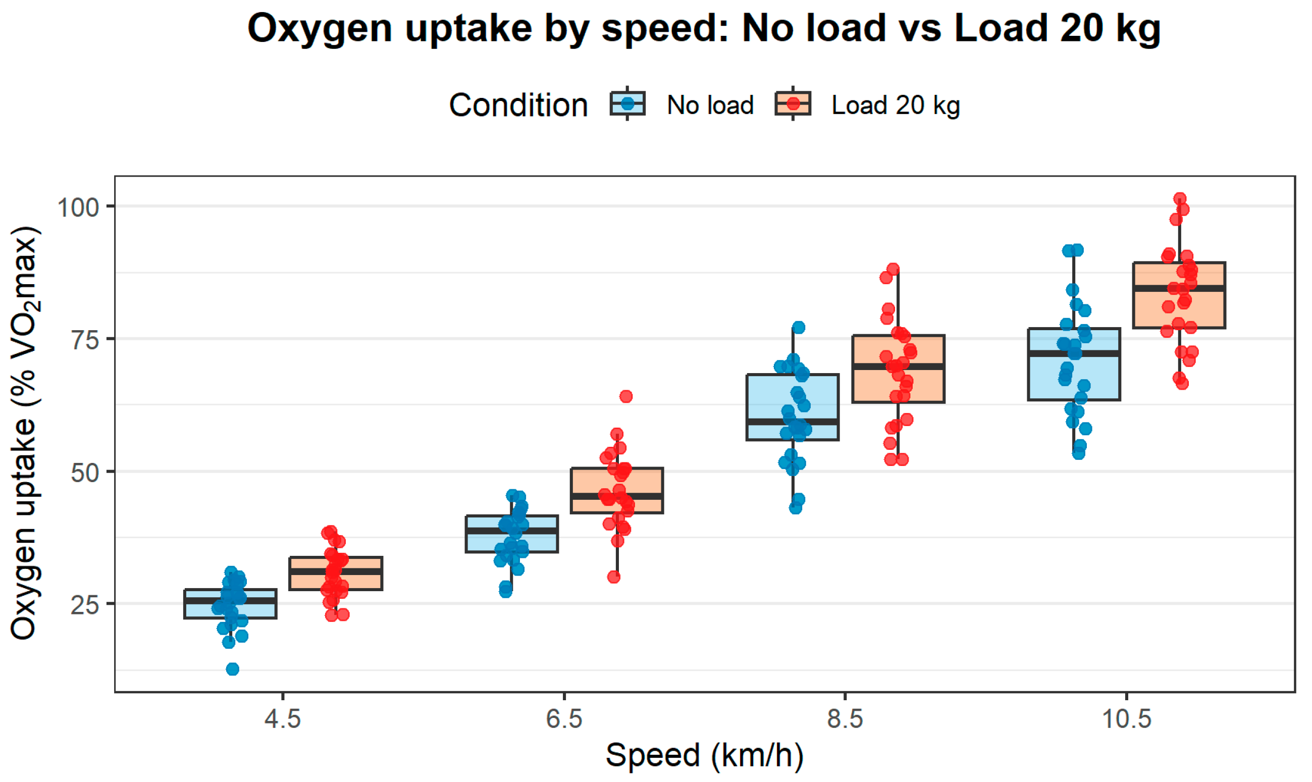 | Parameter/Stage | Speed (km/h) | No Equipment Load | Equipment Load (20 kg) | ||
