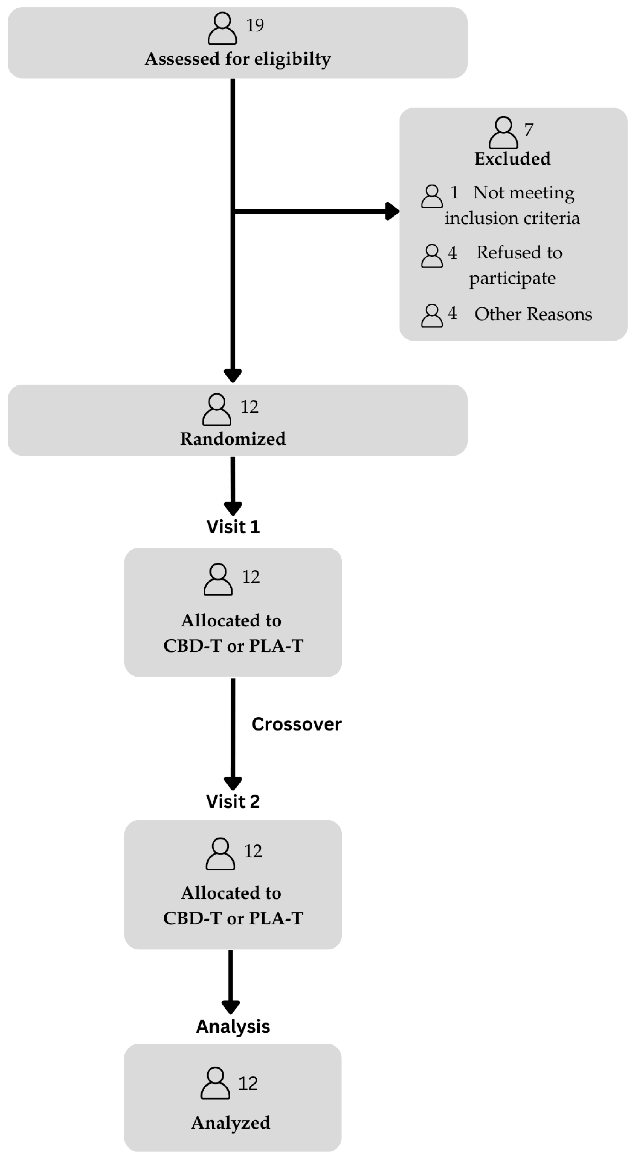 Each person took the CBD or placebo capsules on 2 separate occasions, with the second visit occurring between 25 and 30 days after the first visit to control for the female menstrual cycle. A CONSORT (Consolidated Standards of Reporting Trials) flow diagram clearly depicts participant progression through each visit of the study (Figure 1). This project was approved by the University of Northern Colorado’s Institutional Review Board (Protocol # 2311054791).