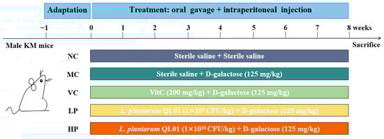 Fifty SPF-grade Kunming mice (male, eight weeks old, weighing 18–24 g) were purchased from the Laboratory Animal Center of Lanzhou University. The mice were group-housed (5 per cage) in positive-pressure isolation cages (BioZone Ltd., Ramsgate, Kent, United Kingdom) with corn cob bedding, Wooden chew blocks were provided as environmental enrichment. The housing environment was maintained at 22 ± 2 °C and 55 ± 10% relative humidity under a 12 h/12 h light-dark cycle. All mice were allowed free access to standard chow diet and autoclaved water. Cage cleaning was performed twice weekly to ensure hygiene. After one week of adaptation, the mice were randomly divided into five groups (n = 10): normal control (NC), model control (MC), positive control (VC), low-dose QL01 (LP), and high-dose QL01 (HP). The mice in the MC, VC, LP, and HP groups were intraperitoneally injected with D-galactose saline solution (Sigma-Aldrich Corporation, St. Louis, MO, USA) at a dose of 125 mg kg−1 day−1. In contrast, the NC group received an equivalent volume of sterile saline. The VC group was additionally administered ascorbic acid at a dose of 200 mg kg−1 day−1. The LP and HP groups were treated with QL01 saline solution at a dose of 1 × 109 CFU mL−1 day−1 and 1 × 1010 CFU mL−1 day−1, respectively. All intraperitoneal injections and oral gavages were performed at a volume of 0.2 mL per mouse, with the actual administered amount adjusted weekly based on individual body weight. The experiment lasted for 8 weeks (Figure 1).