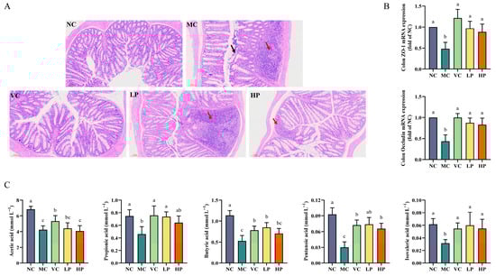 Histological analyses were performed using H&E staining to assess the impact on the colon. The observations showed that the integrity of the intestinal barrier was compromised in the MC group (red arrow) in comparison with the NC group. A significant number of inflammatory cells were observed in the basal layer, and intestinal mucosal epithelial cells were shed, leaving portions of the intestinal mucosa absent. Additionally, the goblet cell sites are severely damaged (black arrow). The treatment of high-dose QL01 was effective compared to the LP group, with a significant reduction in inflammatory cells, normalization of the intestinal mucosa, and preservation of the basal layer structure (Figure 4A). Furthermore, it was found that ZO-1 and Occludin expression levels decreased significantly in ageing mice by analyzing tight junction proteins mRNA levels. However, the QL01 treatment caused them to become significantly upregulated (p < 0.05) (Figure 4B). In addition, the SCFAs levels were significantly lower in the MC group. In contrast, QL01 resulted in a significant increase in SCFAs levels (p < 0.05) (Figure 4C). These results indicated that QL01 restored intestinal homeostasis in ageing mice.