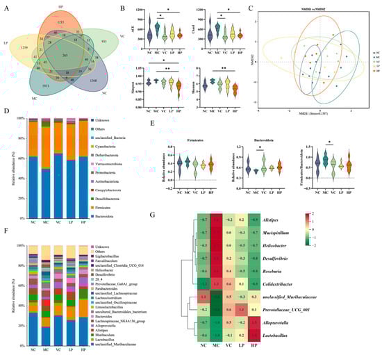 Beta diversity analysis, aided by non-metric multidimensional scaling (NMDS), provided valuable insights into comparison of gut microbiota composition across groups. As shown in Figure 5C, the sample points of the normal control (NC) and model control (MC) groups exhibited limited overlap, suggesting that D-galactose may alter the composition of the gut microbiota. Among the intervention groups, the HP group showed greater overlap with the MC group compared to the VC and LP groups, indicating that supplementation with QL01 may help shift the gut microbiota structure of aging mice toward a normal state. These results imply that QL01 could have a beneficial modulatory effect on the gut microbiota composition in aging mice.