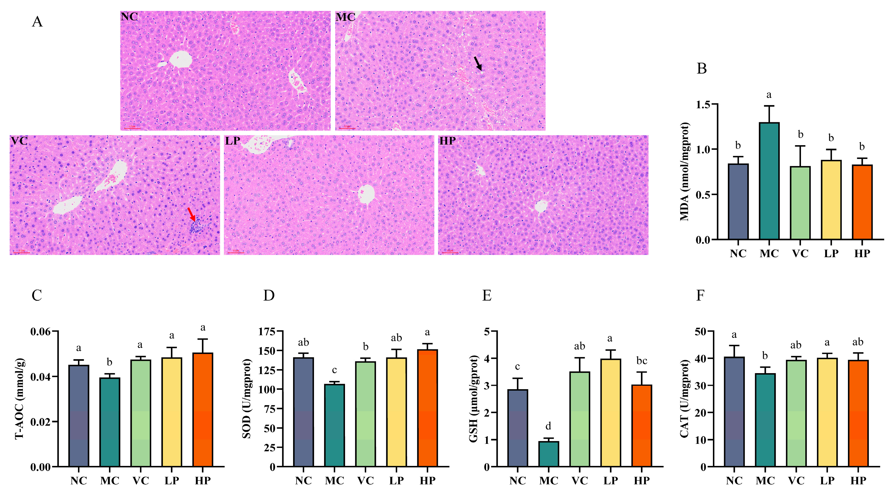 - Jin, D.; Jia, C.; Yang, B.; Wu, Y.; Chen, L.; Liu, R.; Wu, M.; Yu, H.; Ge, Q. The ameliorative mechanism of Lactiplantibacillus plantarum NJAU-01 against D-galactose induced oxidative stress: A hepatic proteomics and gut microbiota analysis. Food Funct. 2024, 15, 6174–6188. [Google Scholar] [CrossRef] [PubMed]