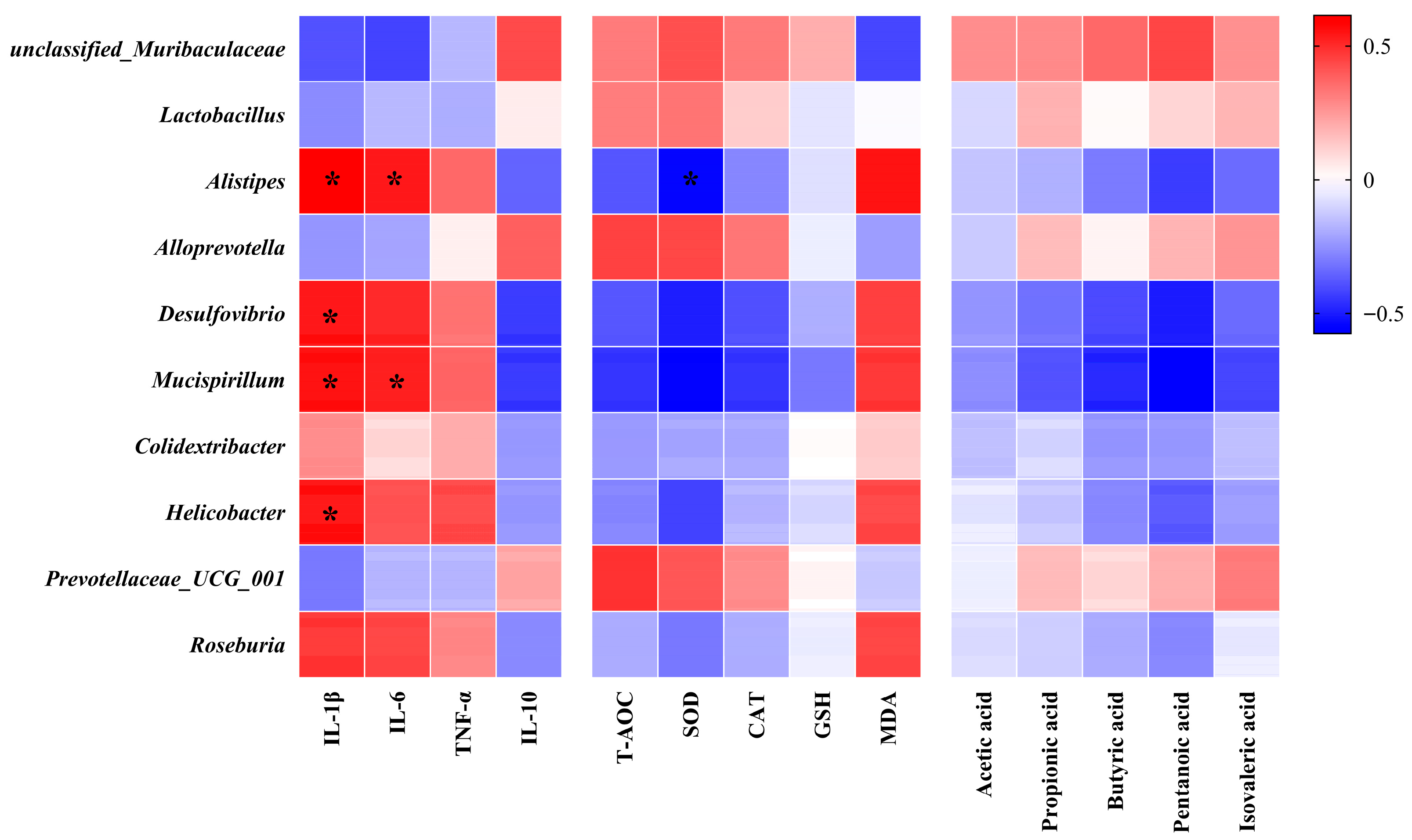 3.7. Correlation Analysis of Gut Microbiota with Biochemical Parameters and SCFAs