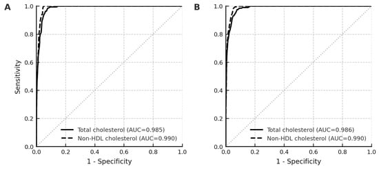 ROC analyses showed comparable discriminatory ability of total cholesterol and non-HDL cholesterol for elevated calculated LDL cholesterol (≥130 mg/dL) in both boys and girls. Among boys, the AUC was 0.985 (95% CI, 0.981–0.989) for total cholesterol and 0.990 (95% CI, 0.987–0.992) for non-HDL cholesterol, with a small but statistically significant difference (p = 0.020). In girls, corresponding AUCs were 0.986 (95% CI, 0.982–0.990) and 0.990 (95% CI, 0.987–0.993), respectively, with no significant difference between the two (p = 0.140) (Figure 1). Across analyses using calculated or directly measured LDL cholesterol as reference, non-HDL cholesterol achieved marginally higher AUC values than total cholesterol.