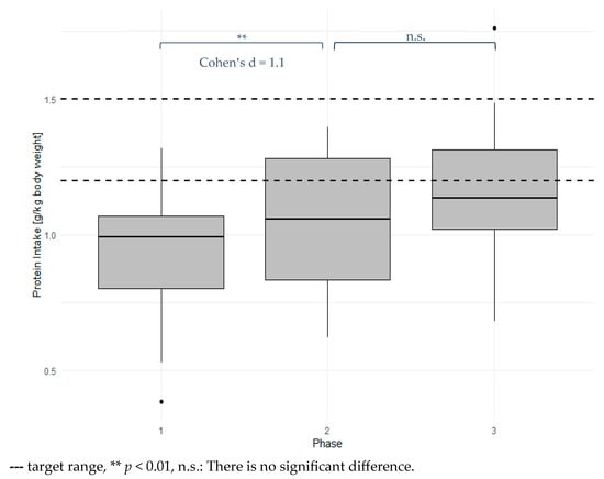 Daily protein intake among the subjects is presented in Figure 2 and was under the recommended amounts (0.93 g/kg bodyweight, SD 0.24). Only one participant in phase one had a daily protein intake according to recommendations. Protein intake was highly significantly increased in phase two (p = 0.007) and phase three (p < 0.001), with large effect sizes (d = 1.12 and 1.52, respectively). Protein intake was increased by 0.13 g/kg bodyweight from phase one to phase two and by 0.05 g/kg bodyweight from phase two to phase three. Only 5 of 14 subjects reached their protein intake goals in phase two, while 5 of 12 reached their protein intake goals in phase three.