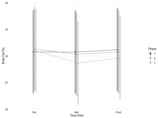 Estimated marginal means of body fat across time points and study phases with 95% confidence intervals.
