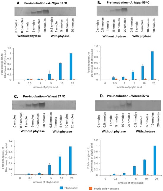 PAGE analysis showing effect of treatment of phytic acid standards with (A) phytase from Aspergillus niger at 37 °C, (B) phytase from Aspergillus niger at 55 °C, (C) phytase from wheat at 37 °C, and (D) phytase from wheat at 55 °C. Representative blots shown (n = 3).
