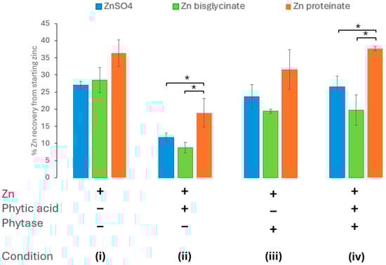 Effect of phytase (Aspergillus niger) activity on zinc bioaccessibility (n = 3) with (i) no added phytic acid or Aspergillus niger phytase, (ii) phytic acid in a 10:100 phytic acid/zinc molar ratio, (iii) added Aspergillus niger phytase, (iv) phytic acid in a 10:100 phytic acid/zinc molar ratio, and Aspergillus niger phytase added. * represents a significant difference between the two data points indicated where p ≤ 0.05 and is detailed in Supplementary Tables S5–S8.