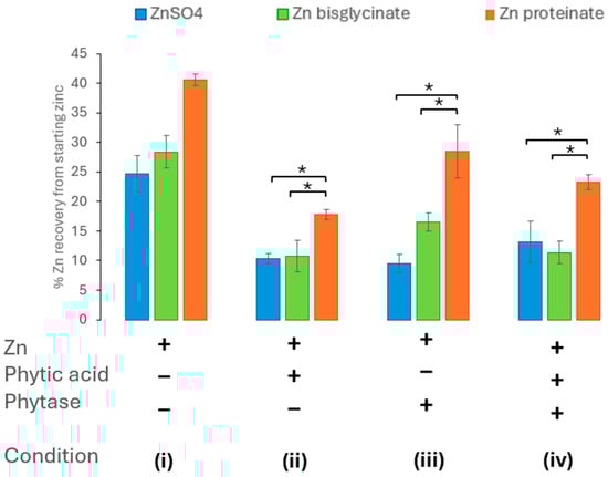 To assess the impact of including Aspergillus niger phytase on zinc bioaccessibility, it was introduced in the oral phase of in vitro digestion at the same time as zinc and phytic acid. This was to accurately mimic digestion in vivo. The inclusion of Aspergillus niger phytase in the in vitro digestion resulted in the amelioration of the effect of phytic acid (at molar ratio of 10:100 phytic acid/zinc) on the bioaccessibility of the ZnSO4 and Zn proteinate (Figure 4, condition iv). Furthermore, when included in isolation, i.e., without the addition of phytic acid, the Aspergillus niger phytase itself did not impact the zinc recovered following the in vitro digestion (Figure 4, condition iii). The chelated Zn proteinate was the most bioaccessible following in vitro digestion, even in the presence of phytic acid and Aspergillus niger phytase (Figure 4, condition ii). It was evident that the recoveries between the two chelated zinc sources, Zn bisglycinate and Zn proteinate, were significantly different under all conditions i–iv (p < 0.01) (Supplementary Tables S5B and S8).