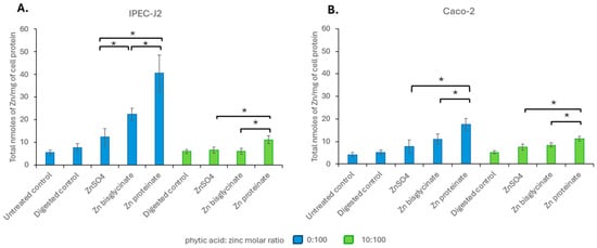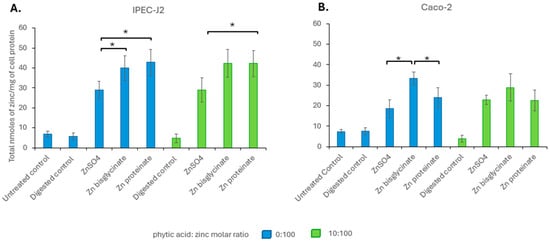Intracellular zinc levels in nanomoles per milligram of cell protein in (A) IPEC-J2 and (B) Caco-2 after a 2 h exposure to 100 μM of zinc following in vitro digestion in the absence (blue) or presence (green) of phytic acid (n = 3). * represents a significant difference between the two data points indicated where p ≤ 0.05 and is detailed in Supplementary Table S13.