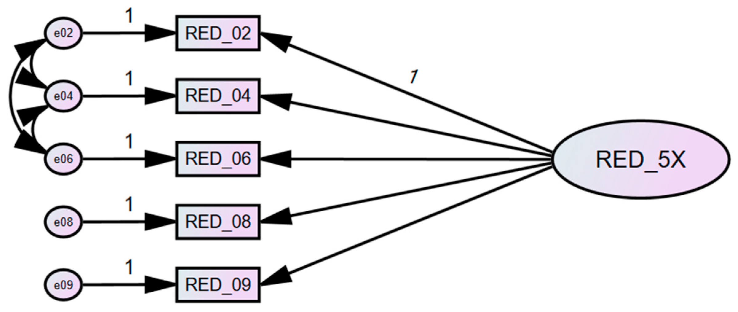17]. The RED-X5 also exhibited satisfactory model fit, reinforcing its structural adequacy as a concise proxy for the full RED-13 [