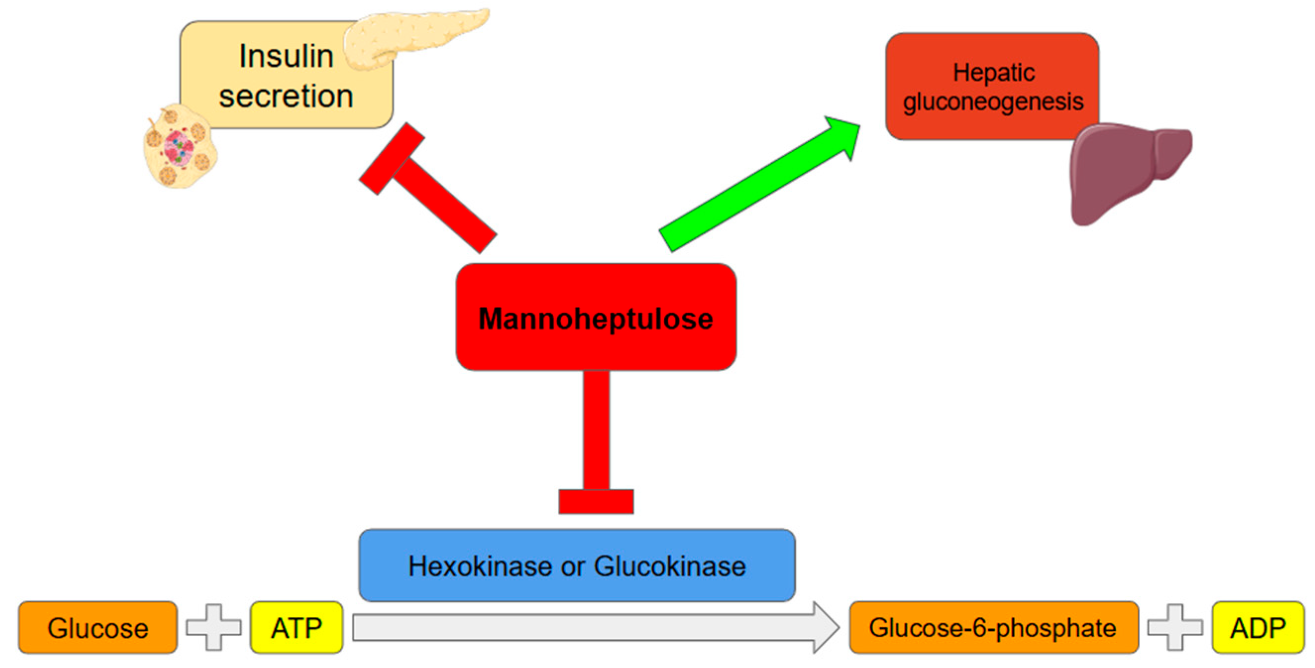 Figure 1. The role of mannoheptulose in glucose metabolism. Abbreviations: ADP—adenosine diphosphate; ATP—adenosine triphosphate. This figure was made using the Servier Medical Art collection (http://smart.servier.com/). Based on [9,14,30,31].
