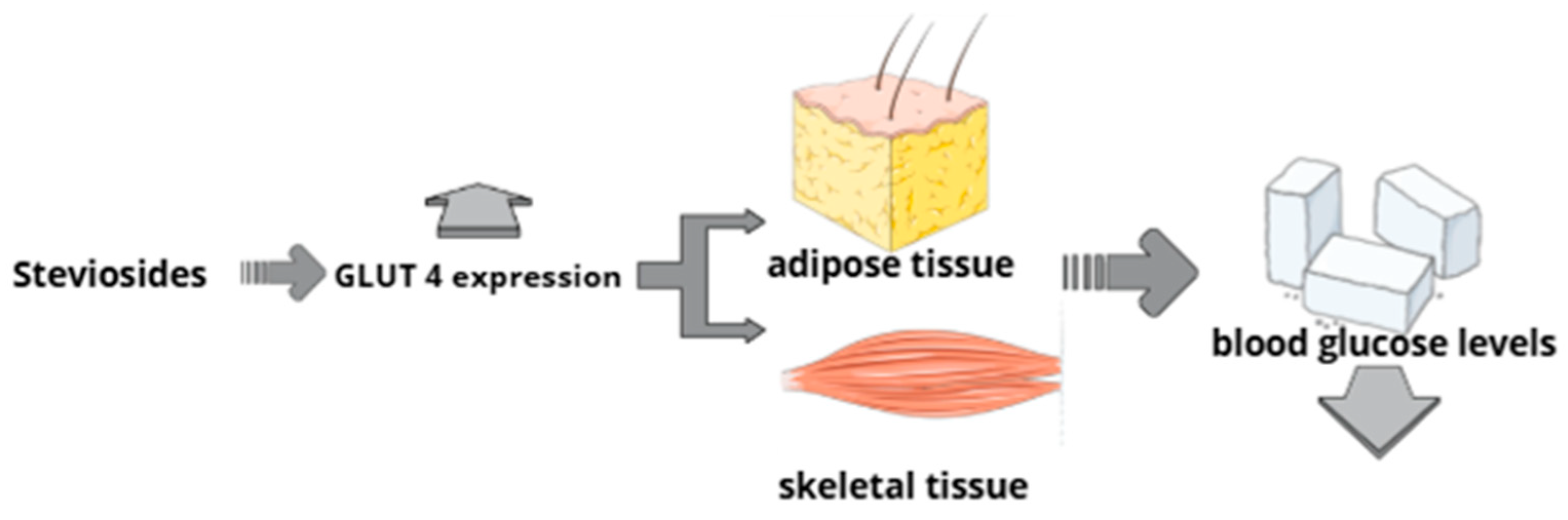Figure 2. The proposed hypoglycemic mechanism of steviosides. Abbreviations: GLUT4—glucose transporter type 4. This figure was made using the Servier Medical Art collection (http://smart.servier.com/) and (https://www.canva.com/). Based on: [97].