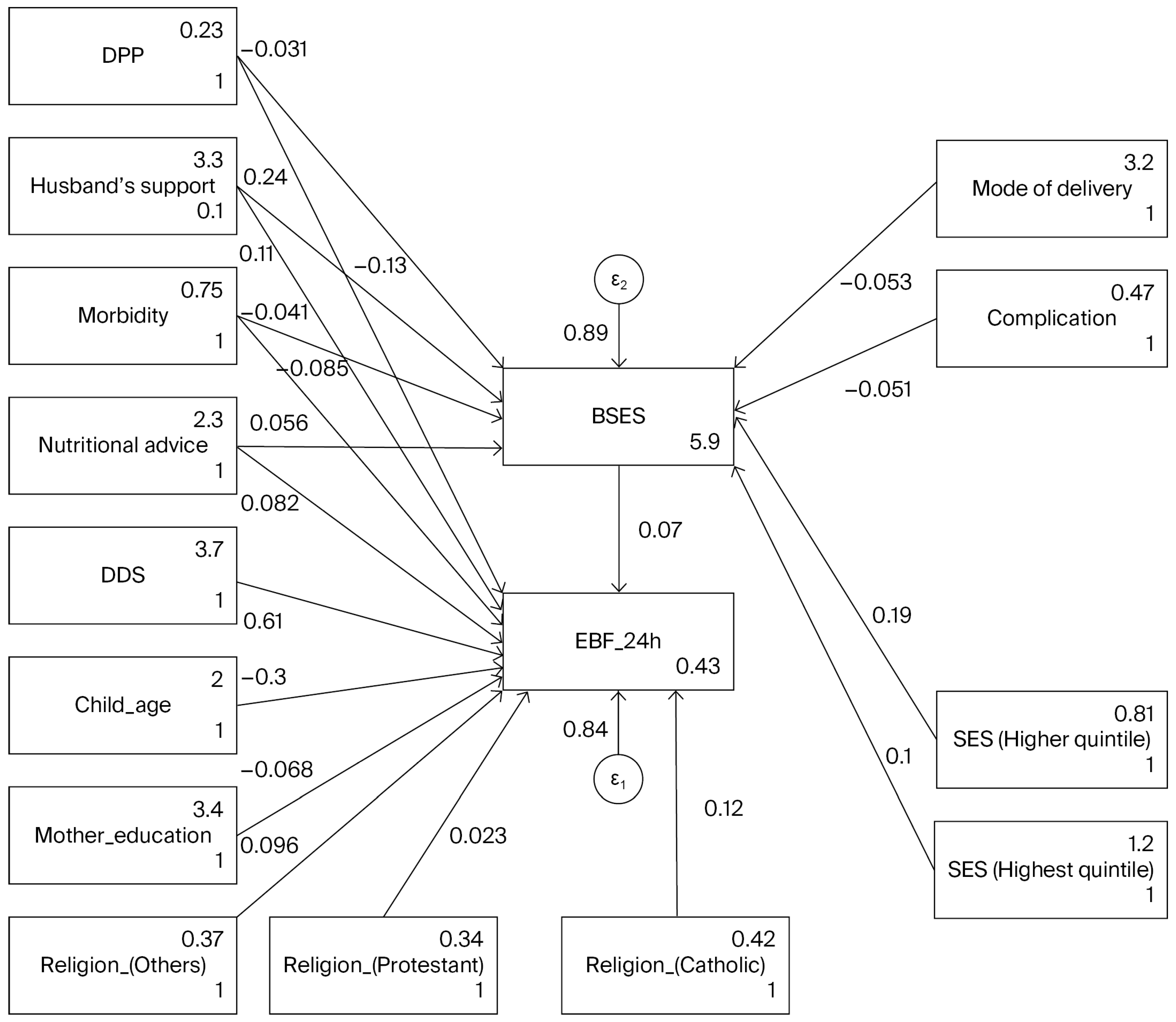 The SEM analysis utilized maximum likelihood estimation with robust standard errors, accounting for clustering within facilities. The model fit was evaluated through iterations of log pseudolikelihood and goodness-of-fit statistics, ensuring the robustness of relationships among variables. Endogenous variables included the Breastfeeding Self-Efficacy Scale and exclusive breastfeeding in the last 24 h, while exogenous variables comprised the child age, religion, dietary diversity score, nutritional education, child’s morbidity in the last two weeks, husband’s support for exclusive breastfeeding, probable major maternal depression, mother’s educational attainment, mode of birth, complications during pregnancy, and socioeconomic status. This comprehensive methodology enabled a clearer understanding of the factors contributing to breastfeeding practices and set the stage for targeted interventions.