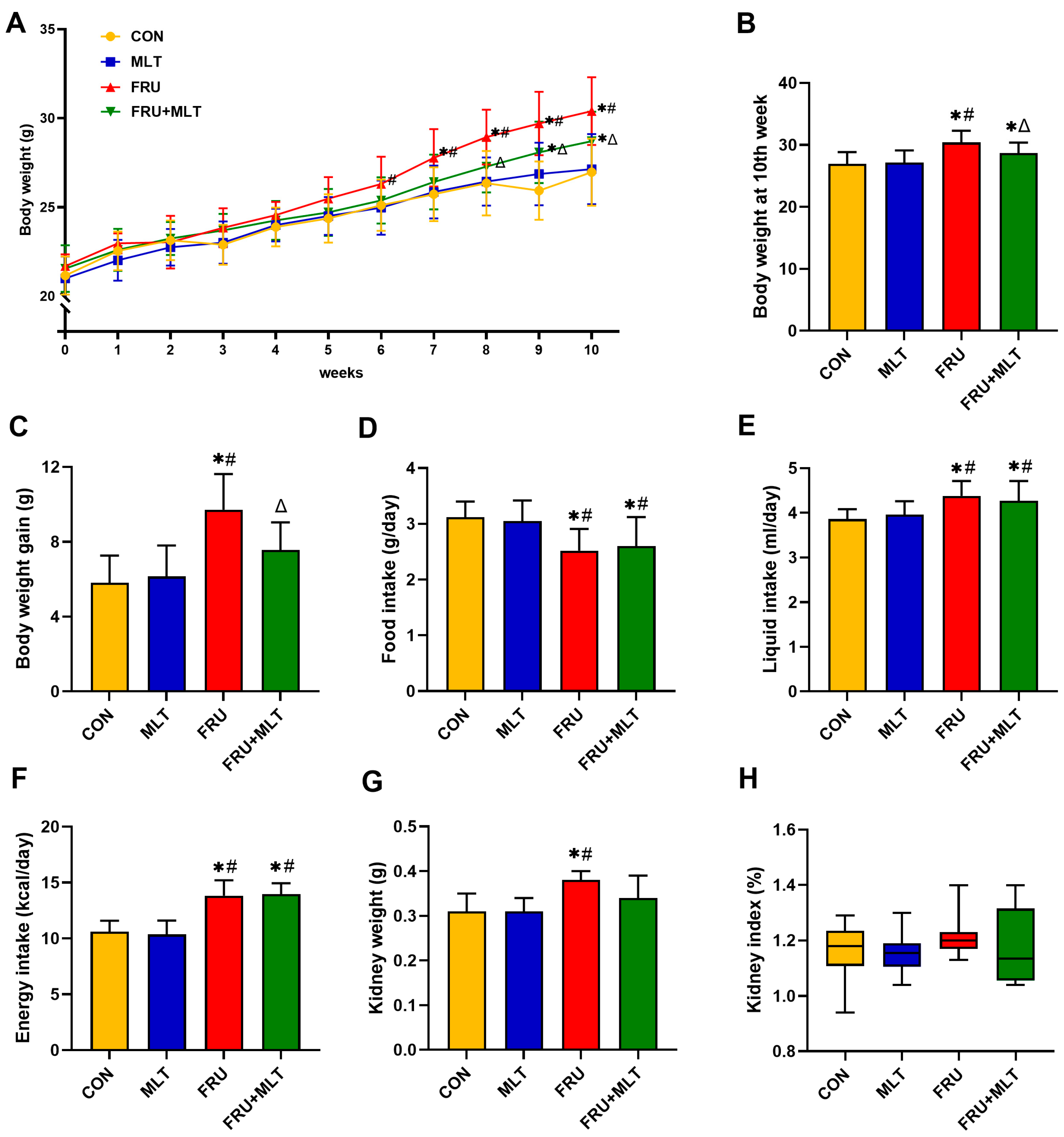 3.1. Effect of MLT on Body Weight and Kidney Index
