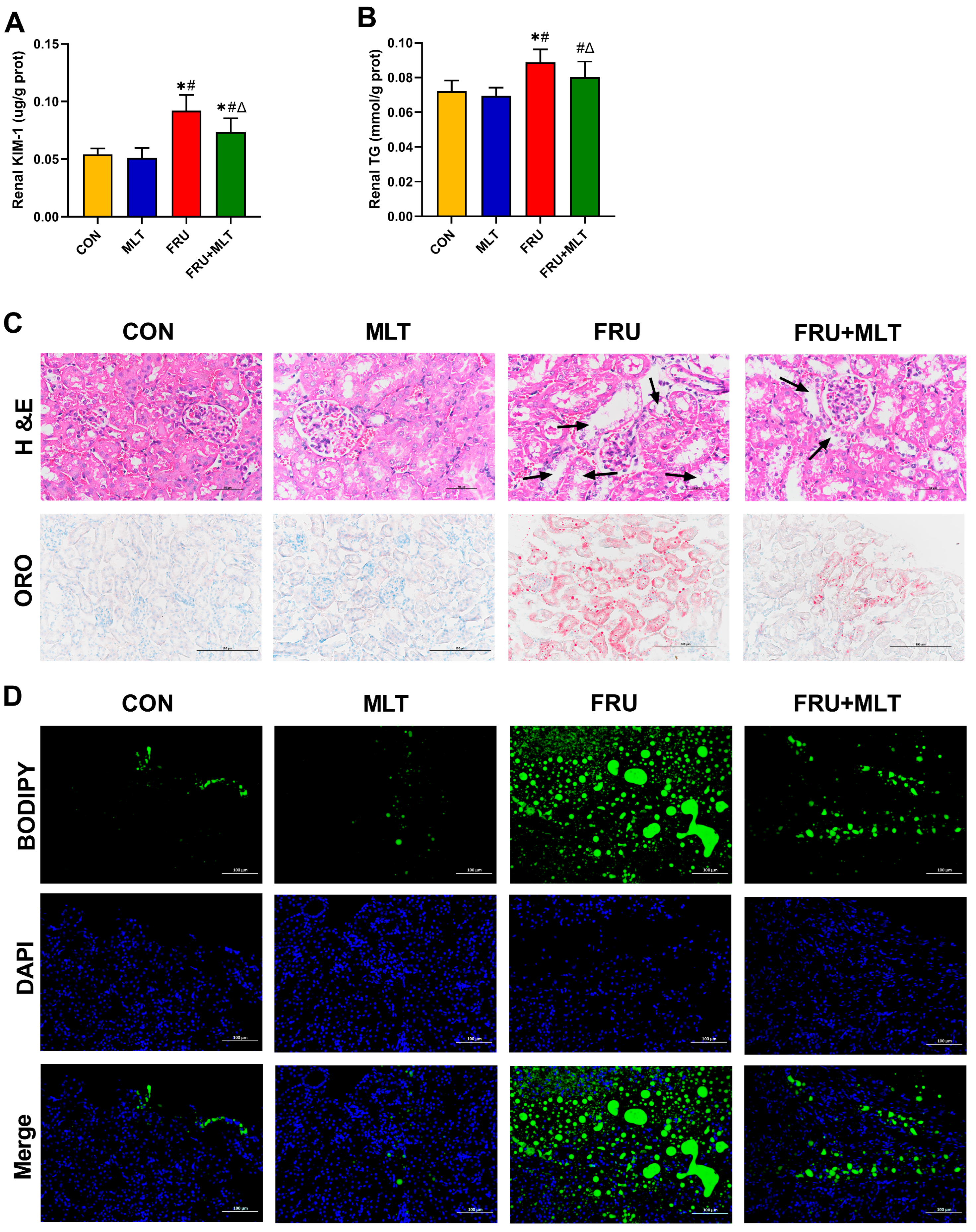 3.3. Effect of MLT on Renal Injury and Renal Lipid Accumulation