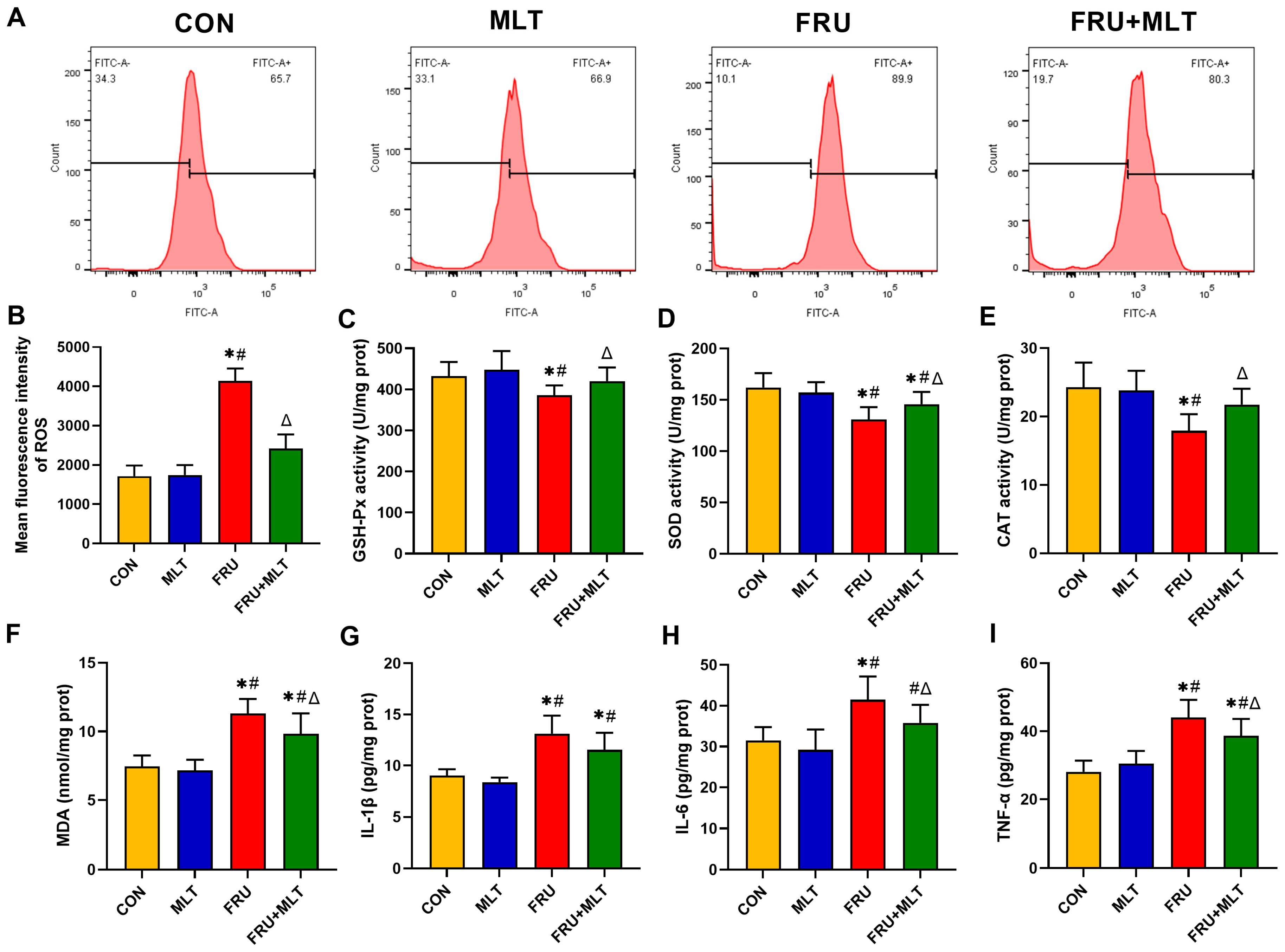3.4. Effect of MLT on Renal ROS Accumulation, Renal Oxidative Stress and Renal Inflammation