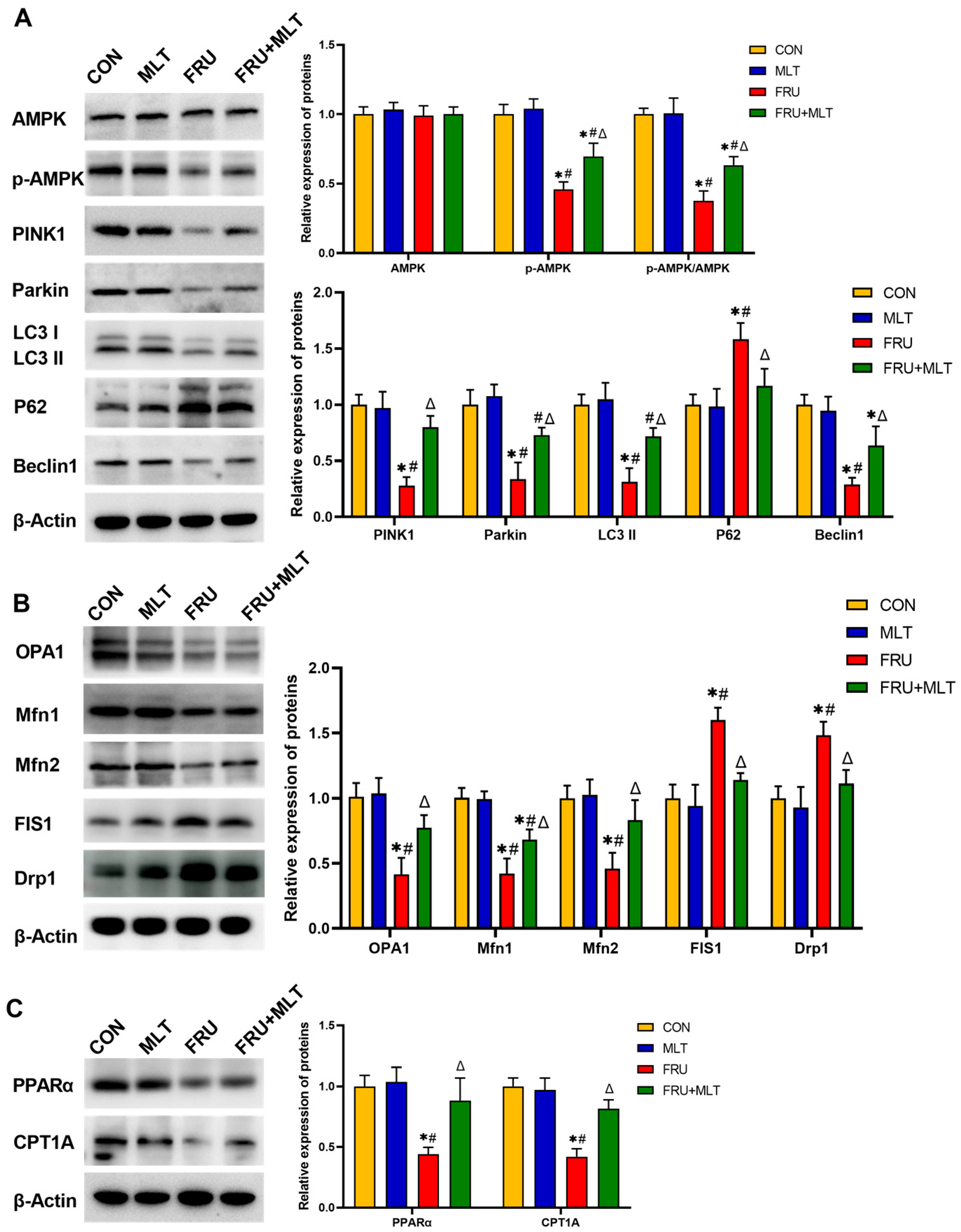 3.6. Effect of MLT on Renal Mitophagy, Mitochondrial Dynamics and FAO-Related Protein Expression