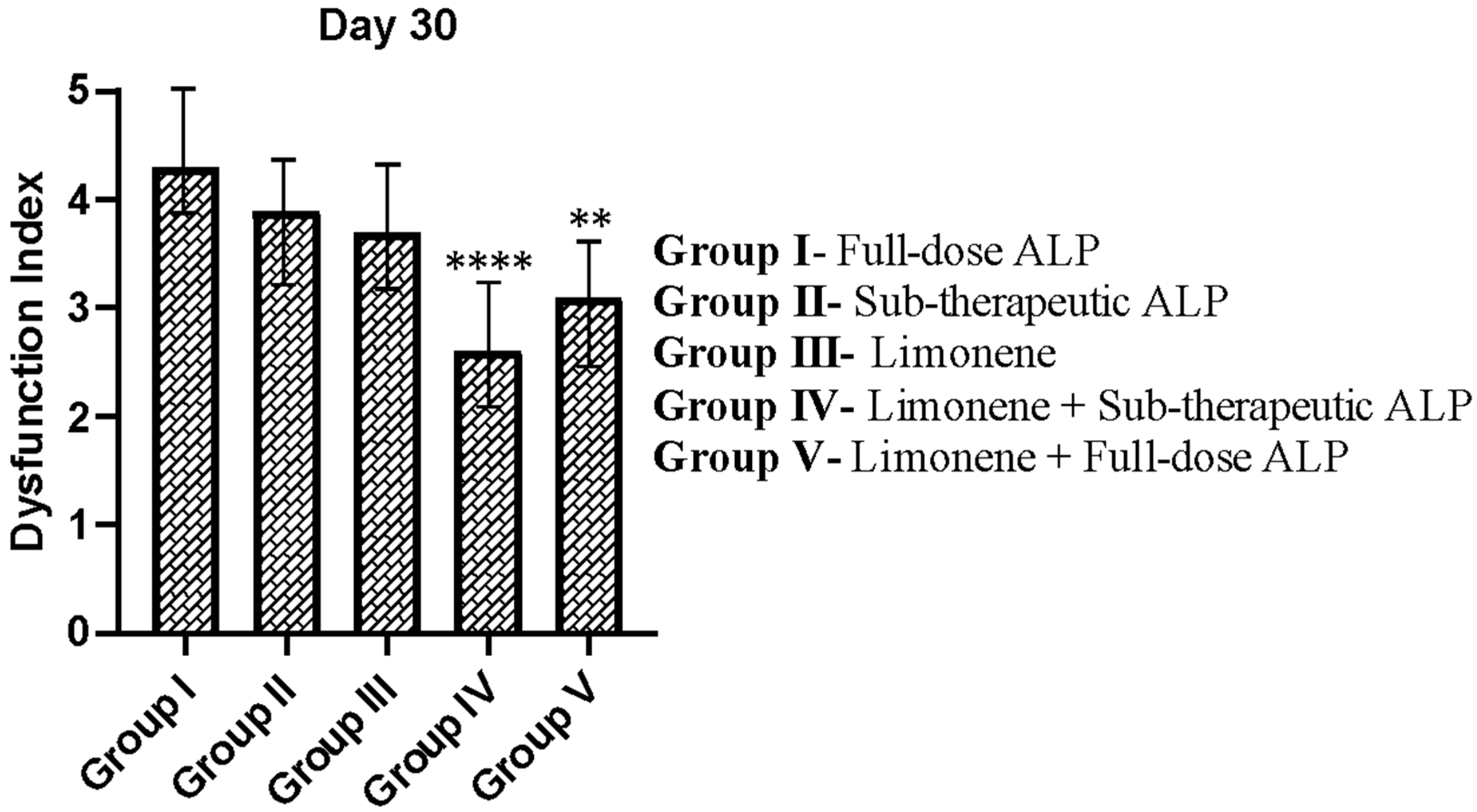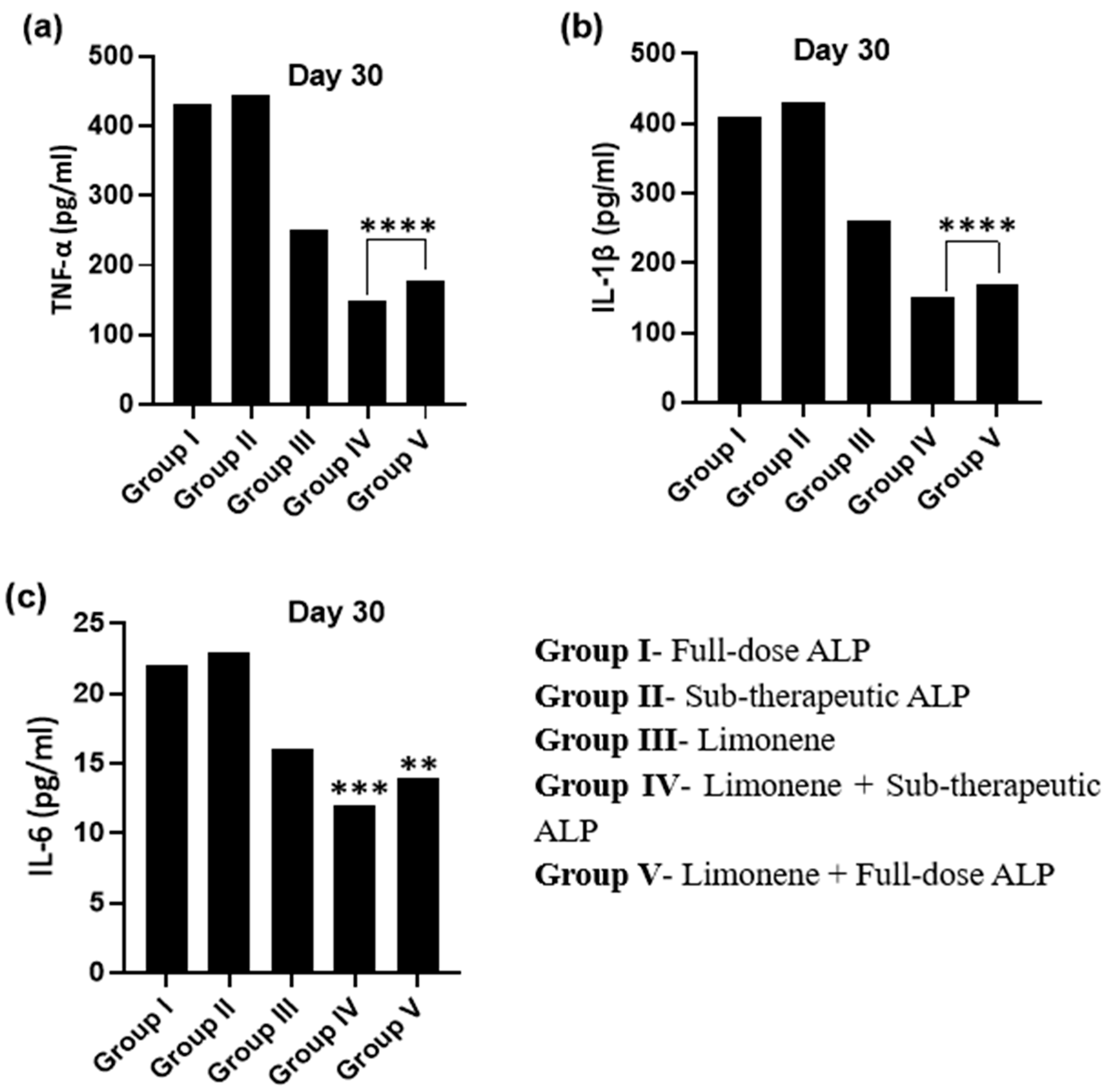 | Group IV-Limonene + Sub-therapeutic ALP | 44.65 ± 0.91 **** | 36.55 ± 0.62 **** |