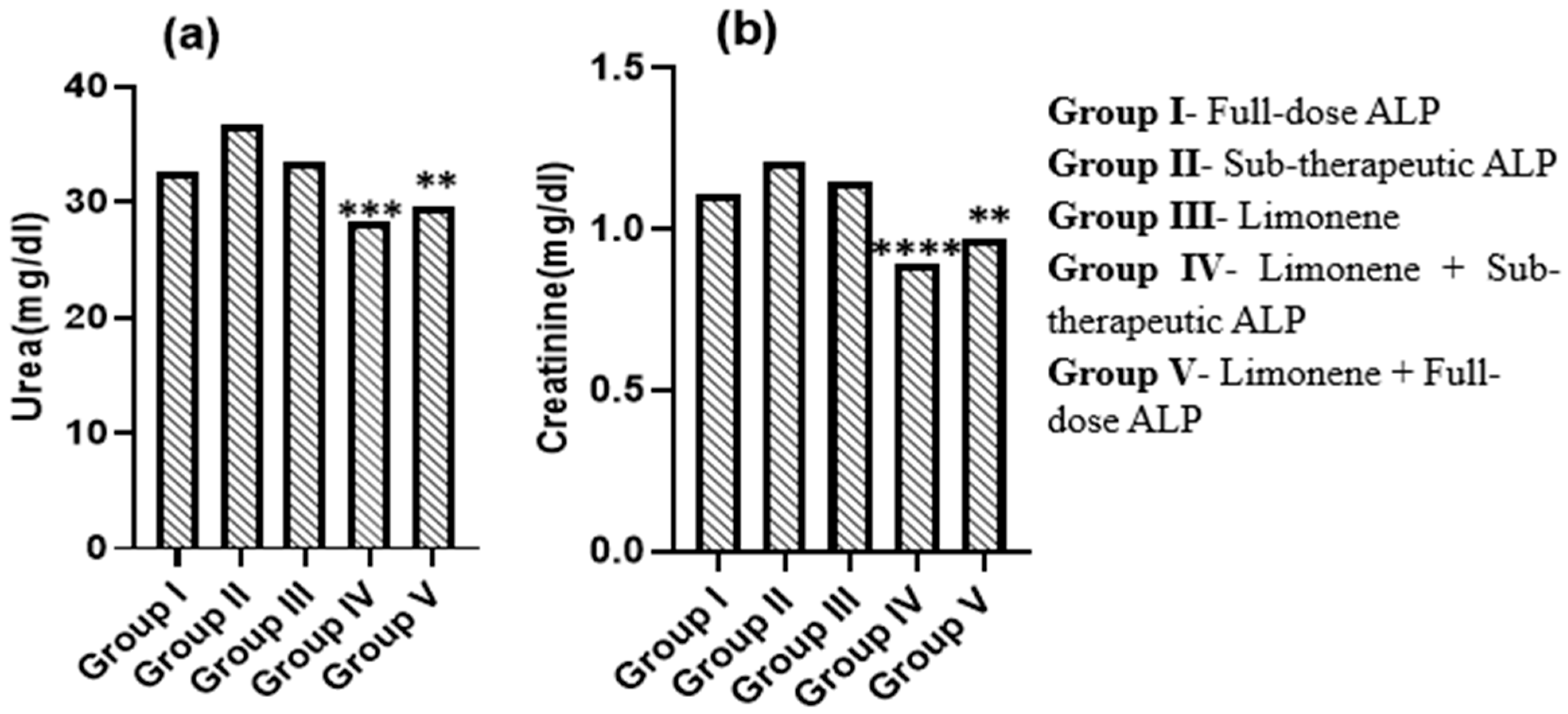 | Group IV-Limonene + Sub-therapeutic ALP | 2.8 ± 0.20 **** | 160.92 ± 6.3 **** | 5.87 ± 3.5 ** | 200.21 ± 7.2 **** |