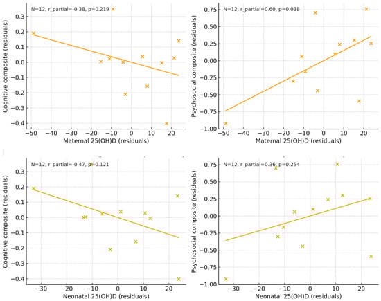 Our neutral findings regarding neonatal 25(OH)D align with reports indicating that cord blood vitamin D may reflect acute maternal status at delivery but does not necessarily predict long-term neurocognitive trajectories. Although our adjusted regression models yielded null findings, exploratory correlations provided suggestive signals. For instance, maternal 25(OH)D was positively correlated with psychosocial composite scores (partial r = 0.60, p = 0.038), whereas neonatal concentrations showed modest associations with communication and social–sentimental domains. Although underpowered, these results raise the possibility that vitamin D may exert subtle domain-specific effects rather than broad cognitive effects. This pattern has been highlighted in studies, in which communication and socio-emotional outcomes were more sensitive to prenatal vitamin D status [3].