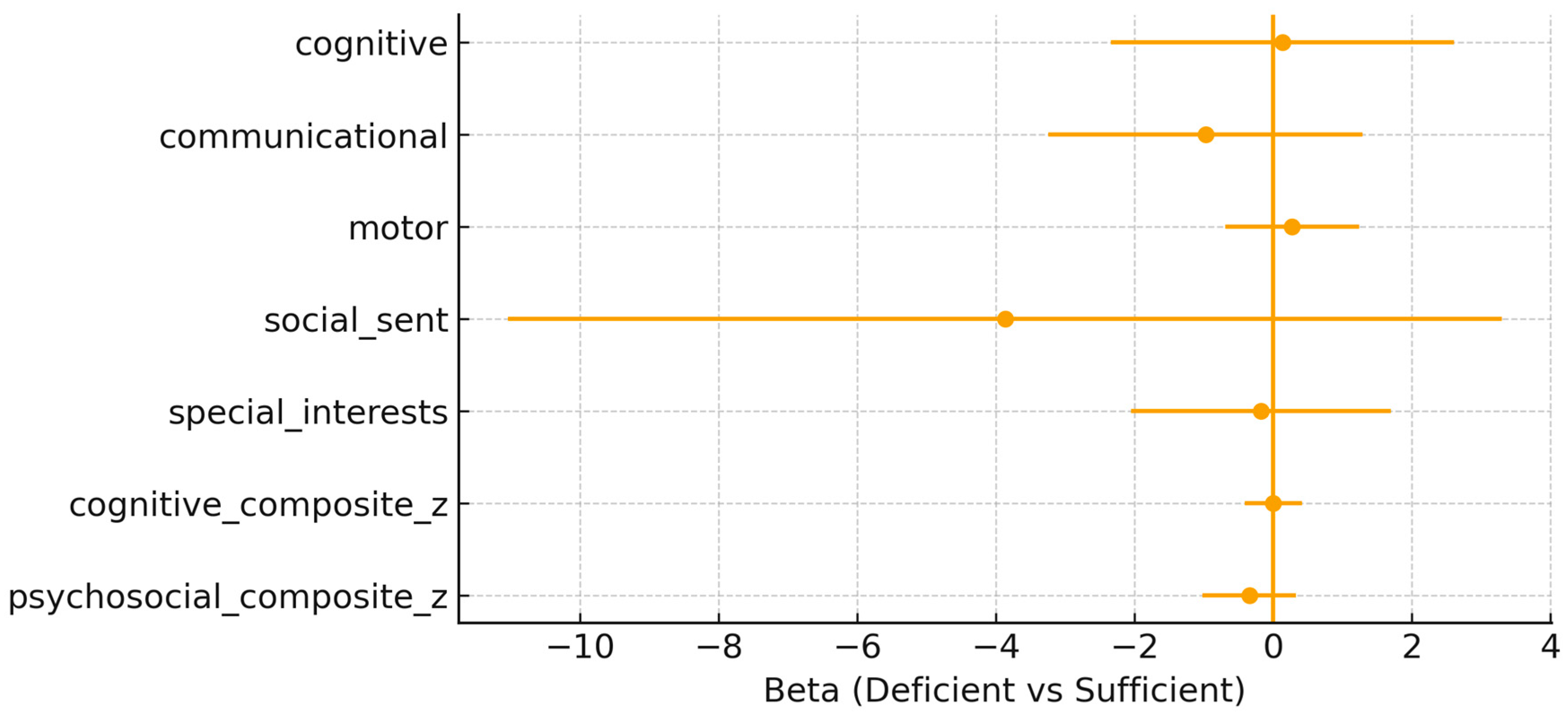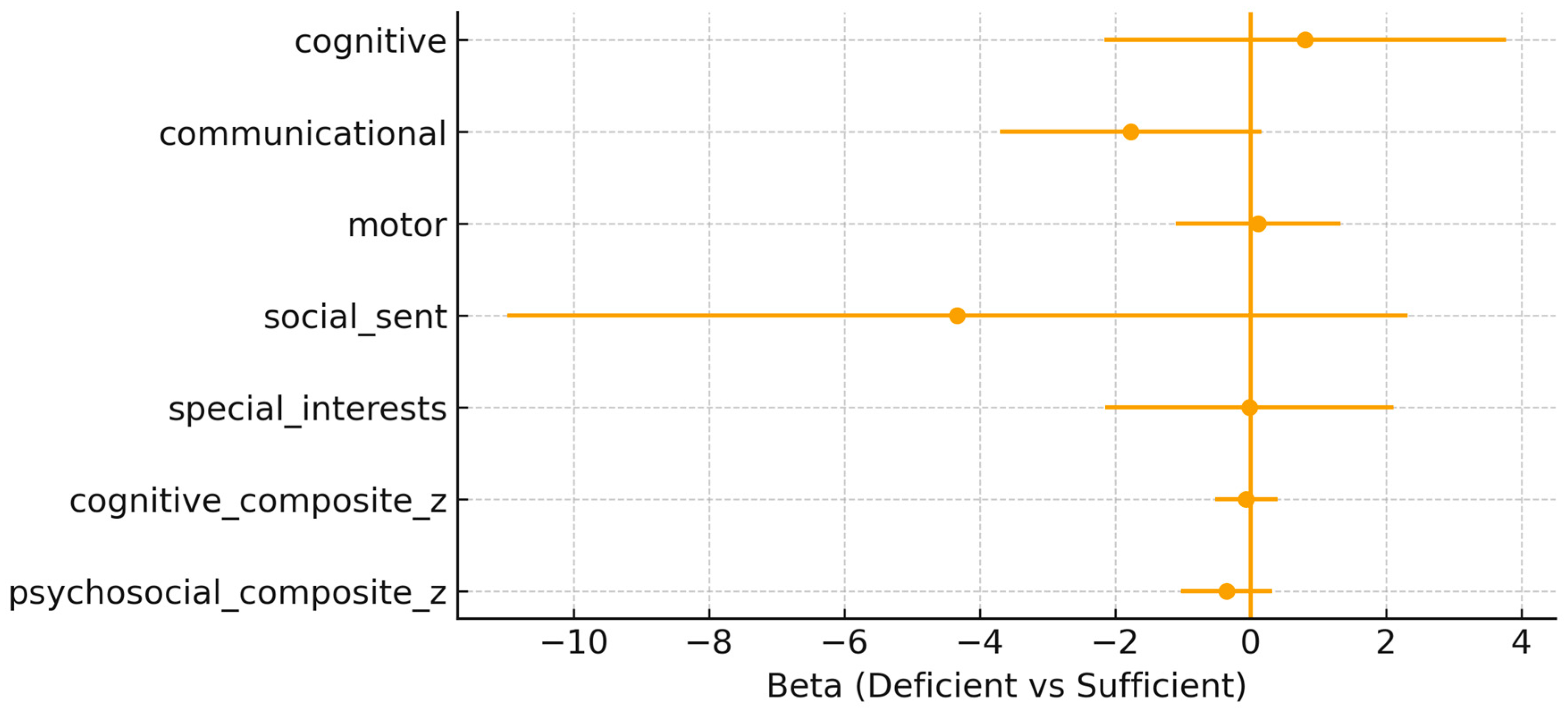 p = 0.070). No associations were detected for cognitive or motor domains, with wide confidence intervals crossing zero. The wide confidence intervals and standard errors indicate considerable uncertainty and should be interpreted accordingly.