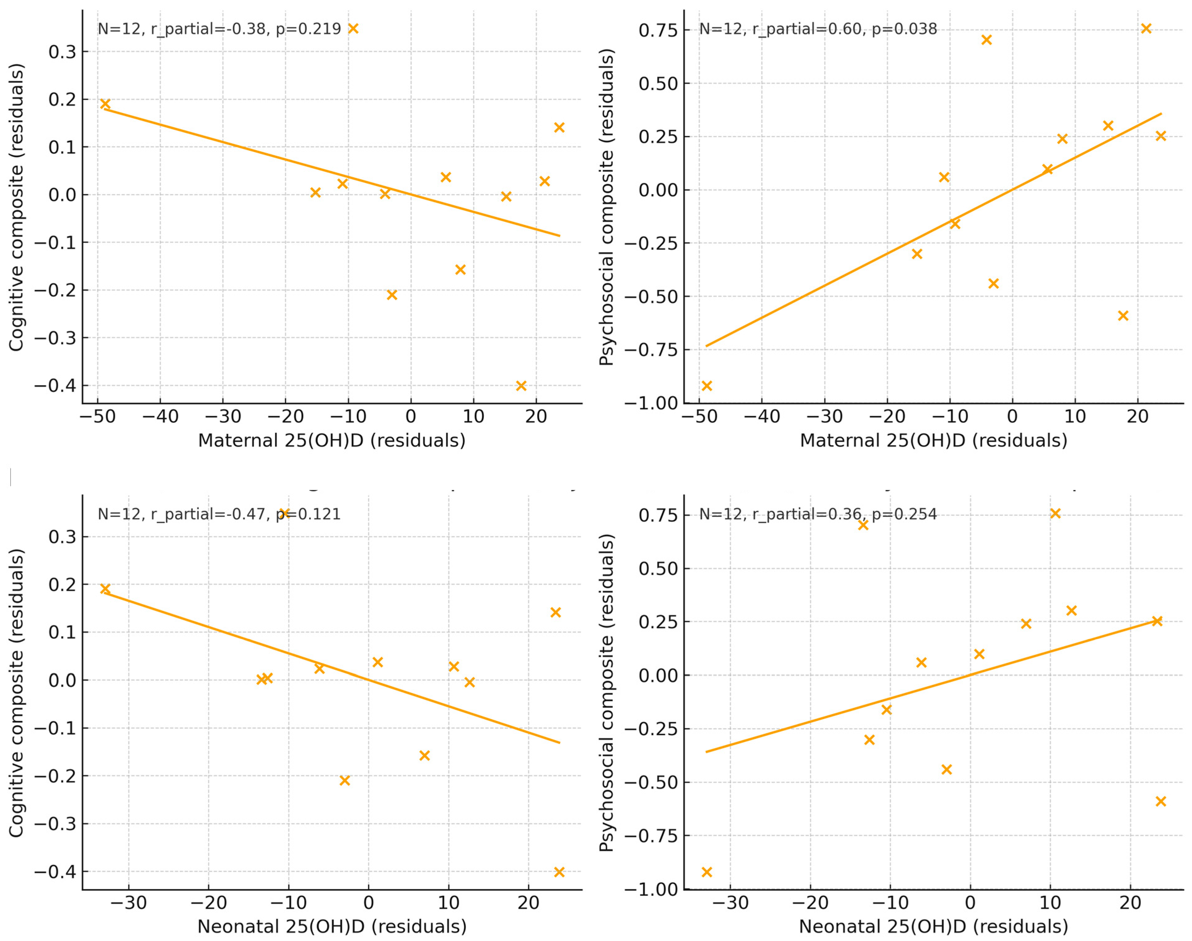 Our neutral findings regarding neonatal 25(OH)D align with reports indicating that cord blood vitamin D may reflect acute maternal status at delivery but does not necessarily predict long-term neurocognitive trajectories. Although our adjusted regression models yielded null findings, exploratory correlations provided suggestive signals. For instance, maternal 25(OH)D was positively correlated with psychosocial composite scores (partial r = 0.60,
