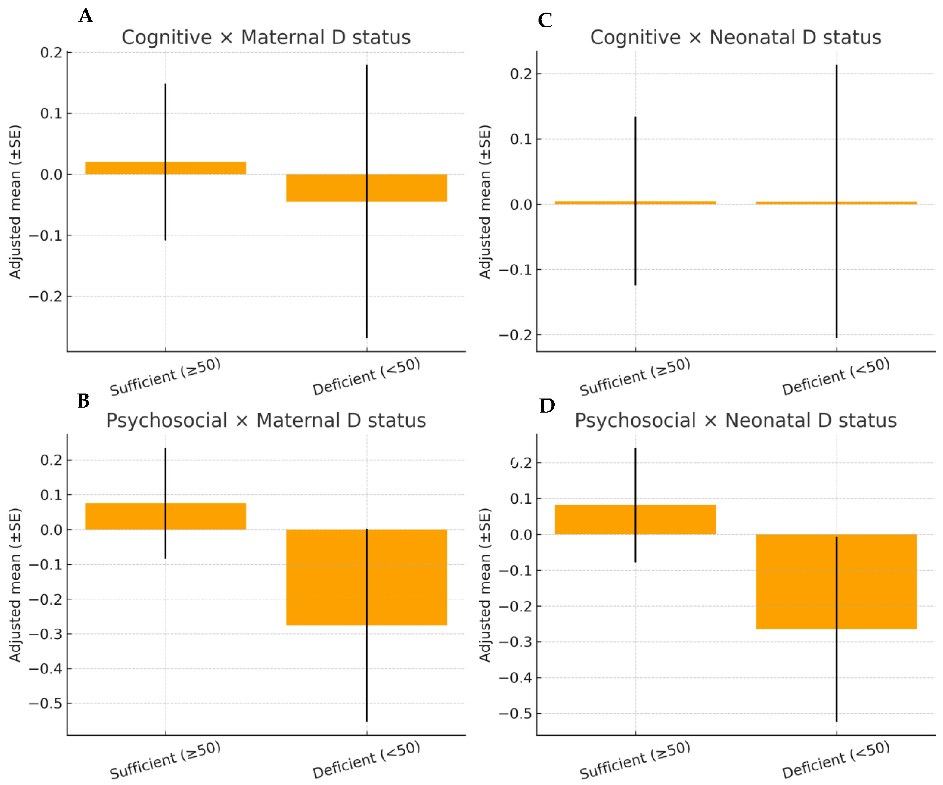 p = 0.038), whereas neonatal concentrations showed modest associations with communication and social–sentimental domains. Although underpowered, these results raise the possibility that vitamin D may exert subtle domain-specific effects rather than broad cognitive effects. This pattern has been highlighted in studies, in which communication and socio-emotional outcomes were more sensitive to prenatal vitamin D status [
