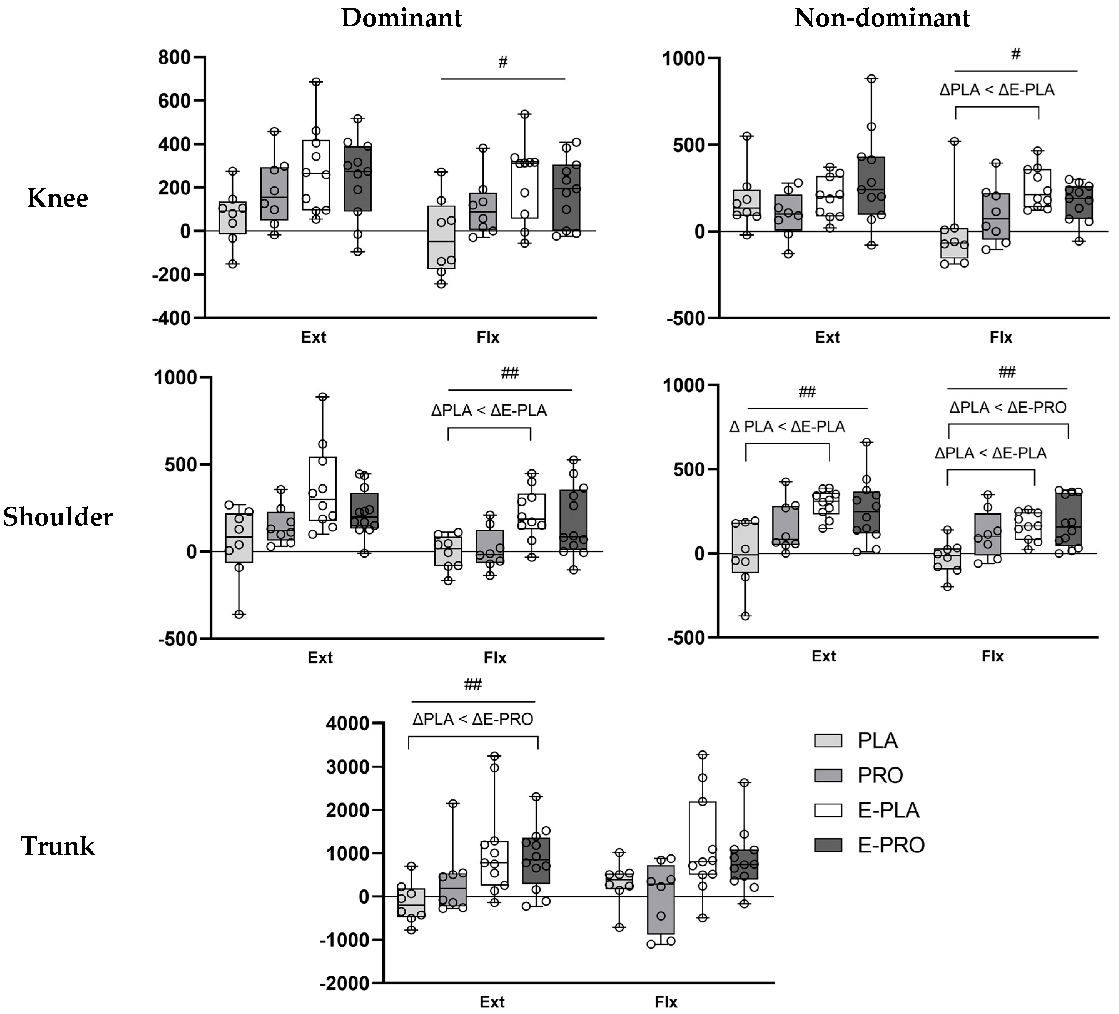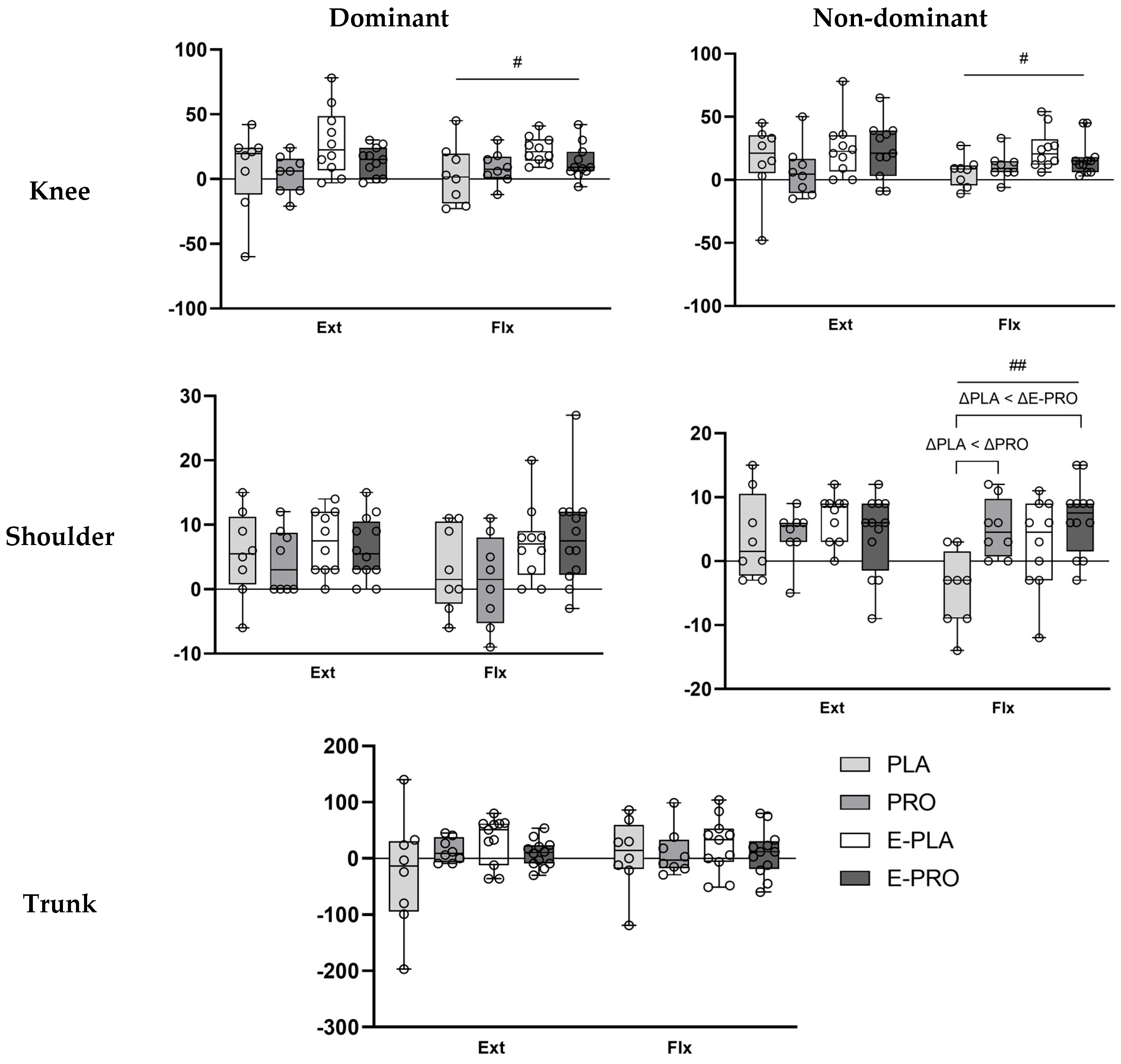| Flx | PLA | 104.38 ± 21.12 | 107.88 ± 26.07 | −0.254 | 0.799 | 0.090 | ||