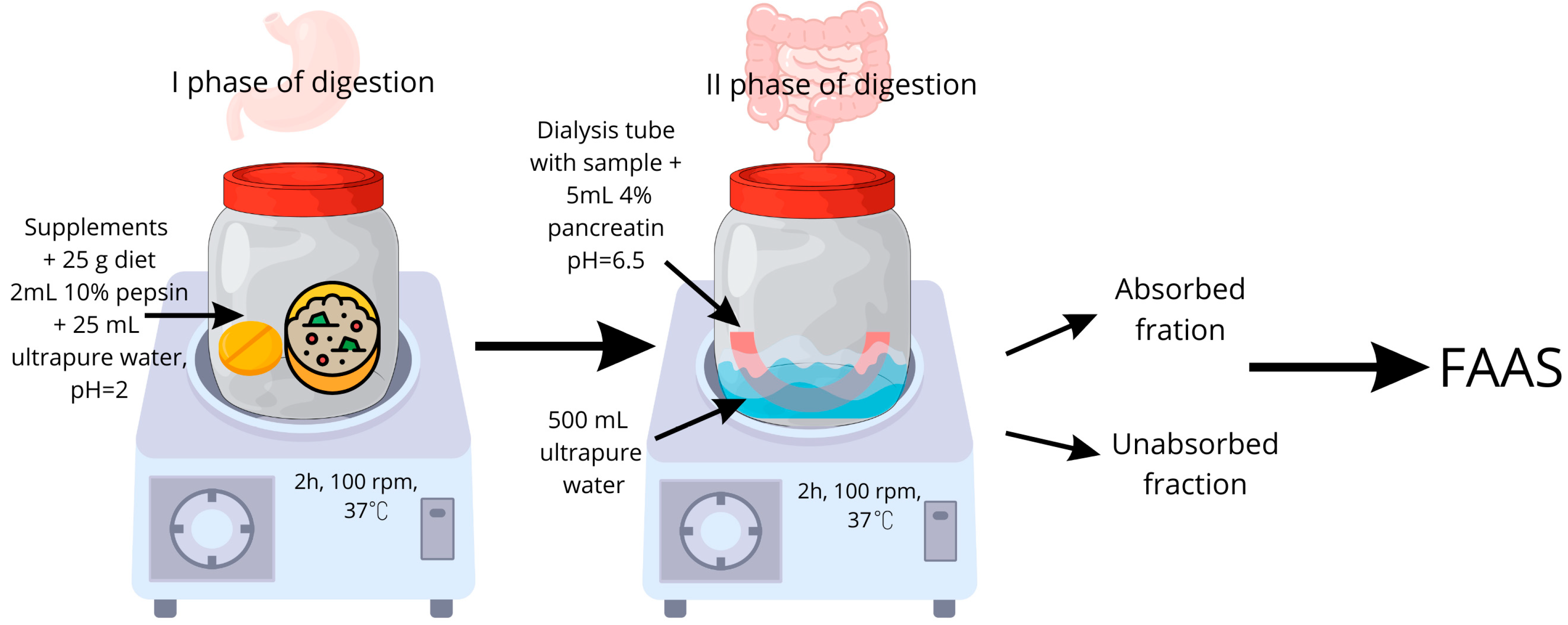 - Supplement-only sample: The manufacturer’s recommended portion of the dietary supplement mixed with 25 mL of ultrapure water, representing the bioaccessibility of the supplement under fasting conditions.