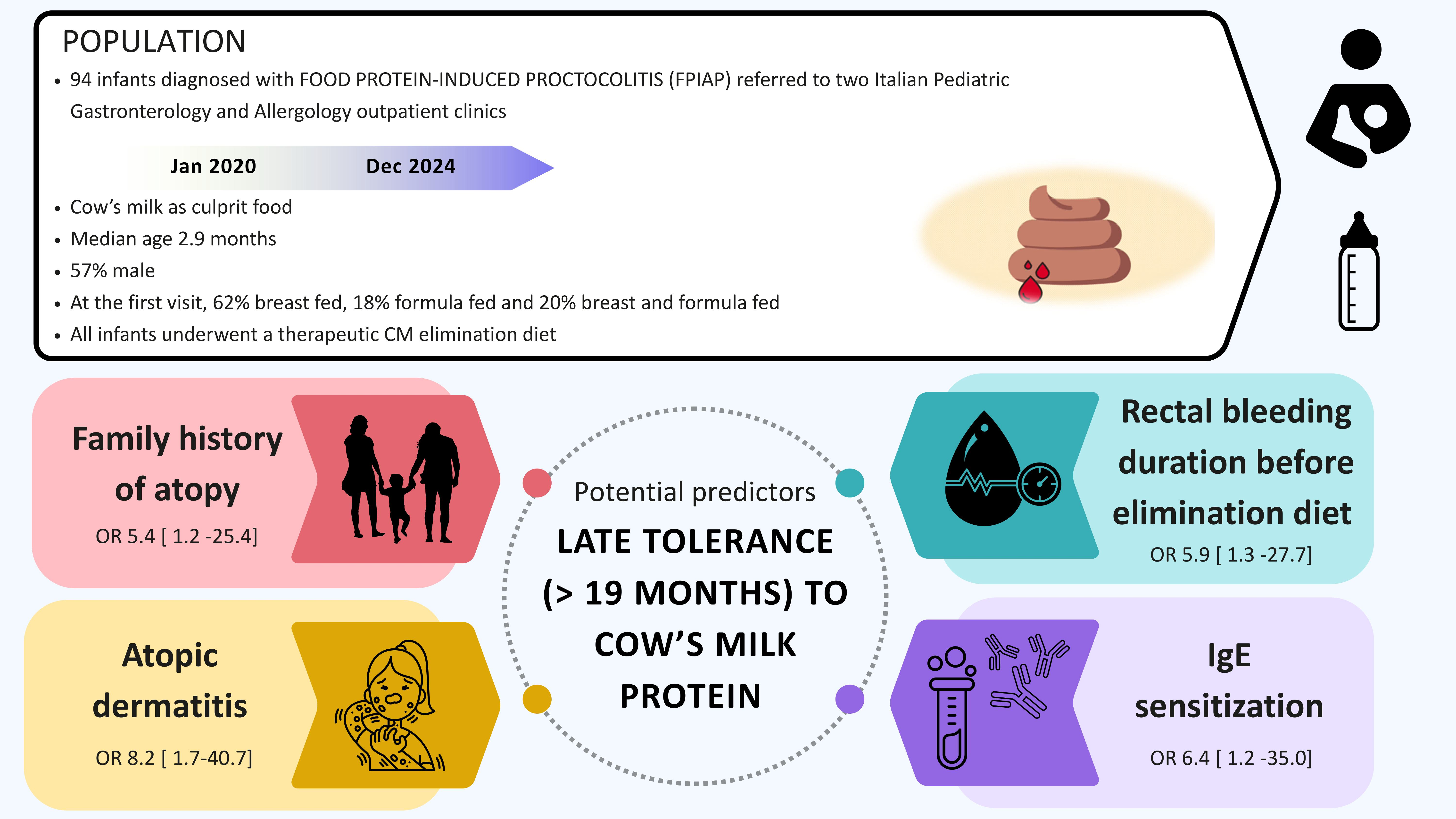 Scavella A, Ferrigno C, Baù M, Colombo A, Tavernelli CI, Zobele M, Borgetto R, Maggi A, Baronti A, Francone A, et al. Identifying Predictors for the Acquisition of Tolerance to Cow’s Milk Protein in Infants with Food Protein-Induced Allergic Proctocolitis (FPIAP): Multifactorial Analysis of Two Italian Cohorts. Nutrients. 2026; 18(1):95. https://doi.org/10.3390/nu18010095