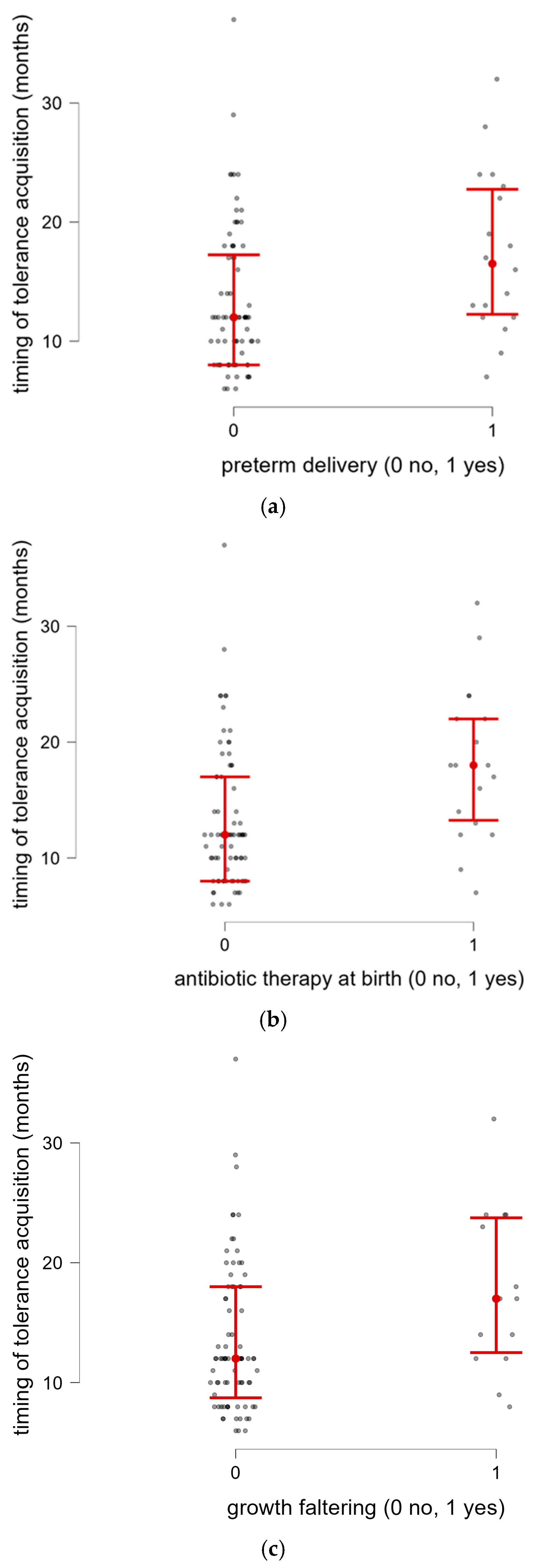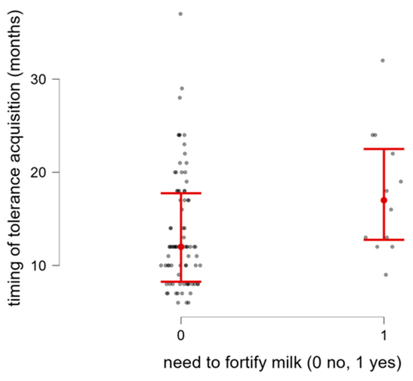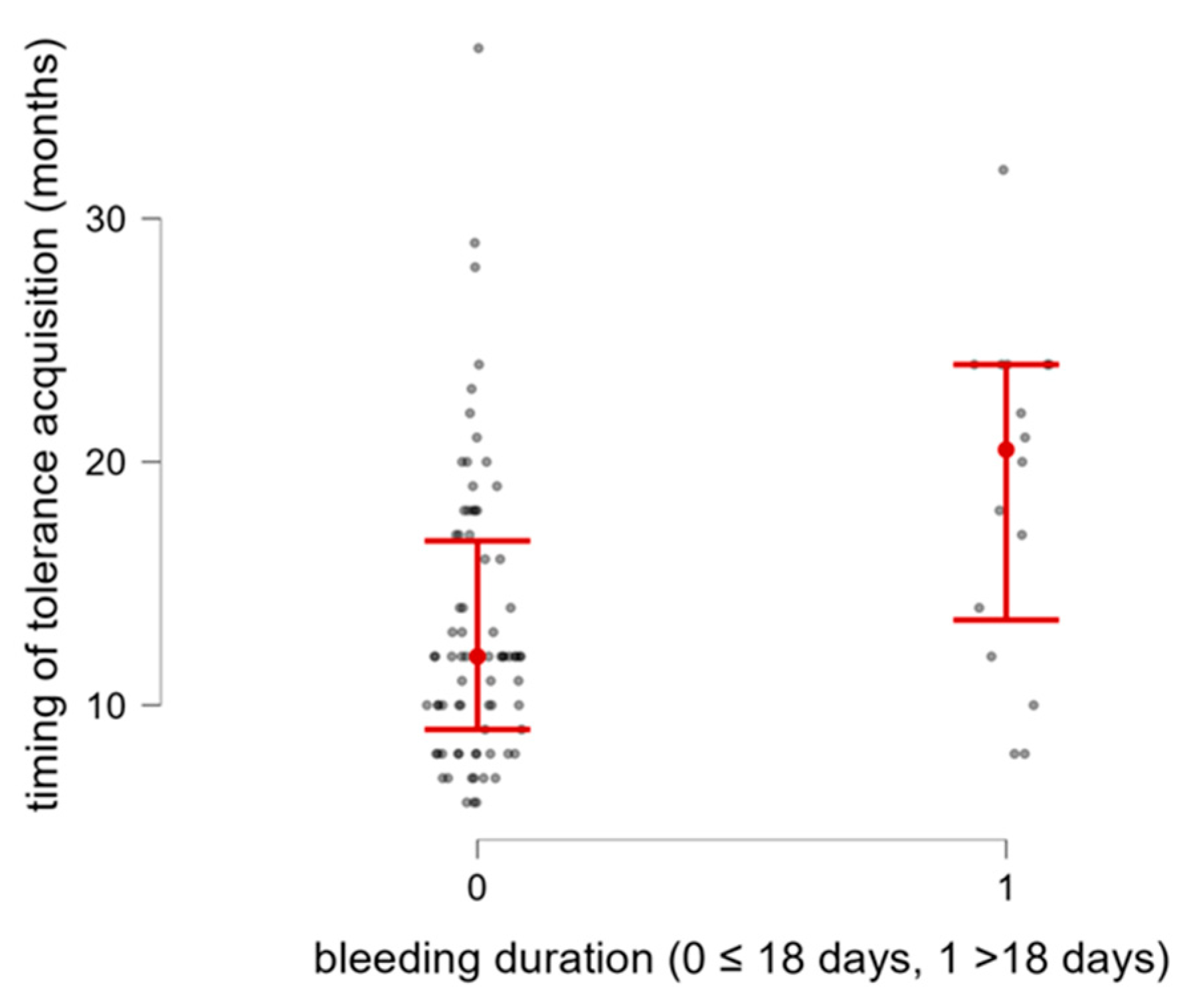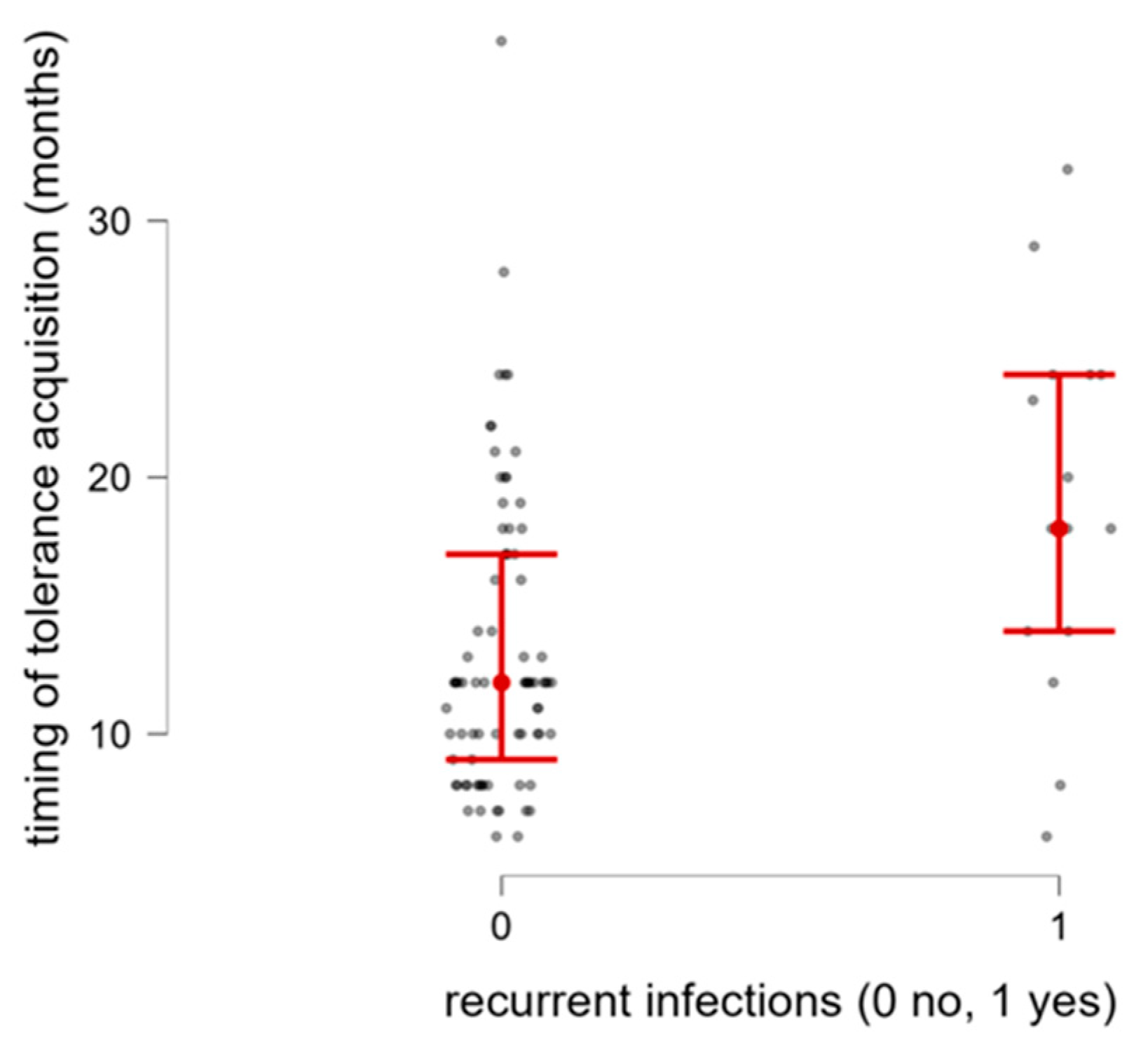 | Age of tolerance acquistion [months] (median and IQR) | 12 (9.7–18) | 94 |