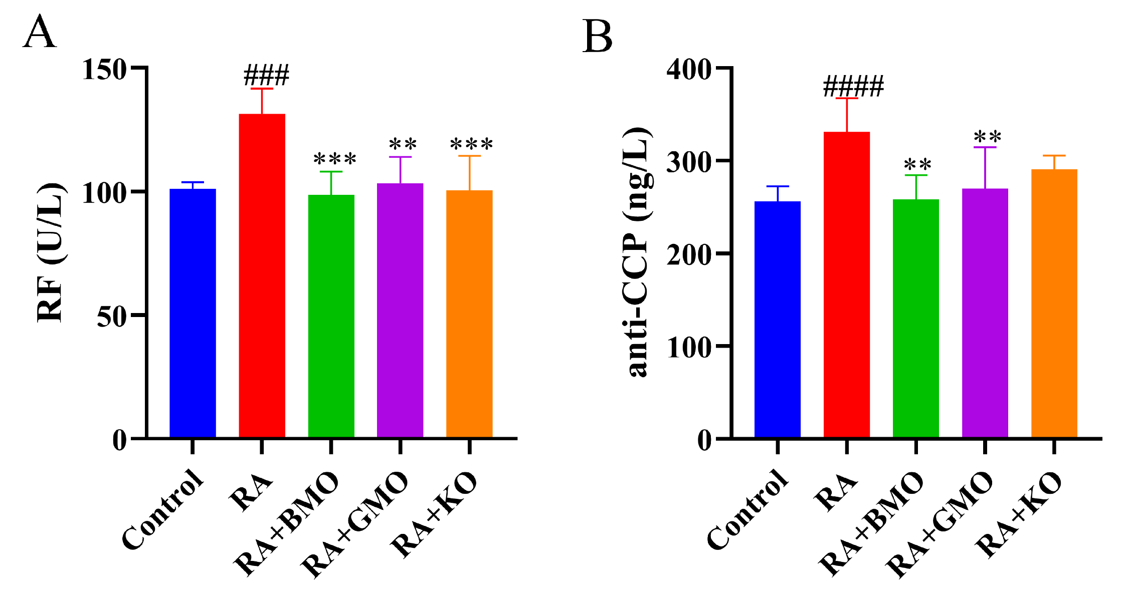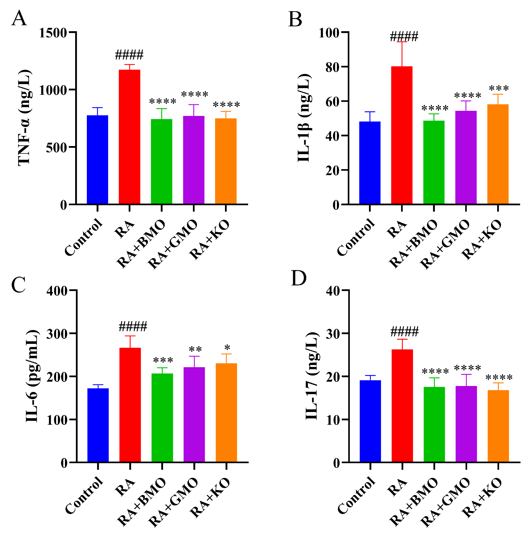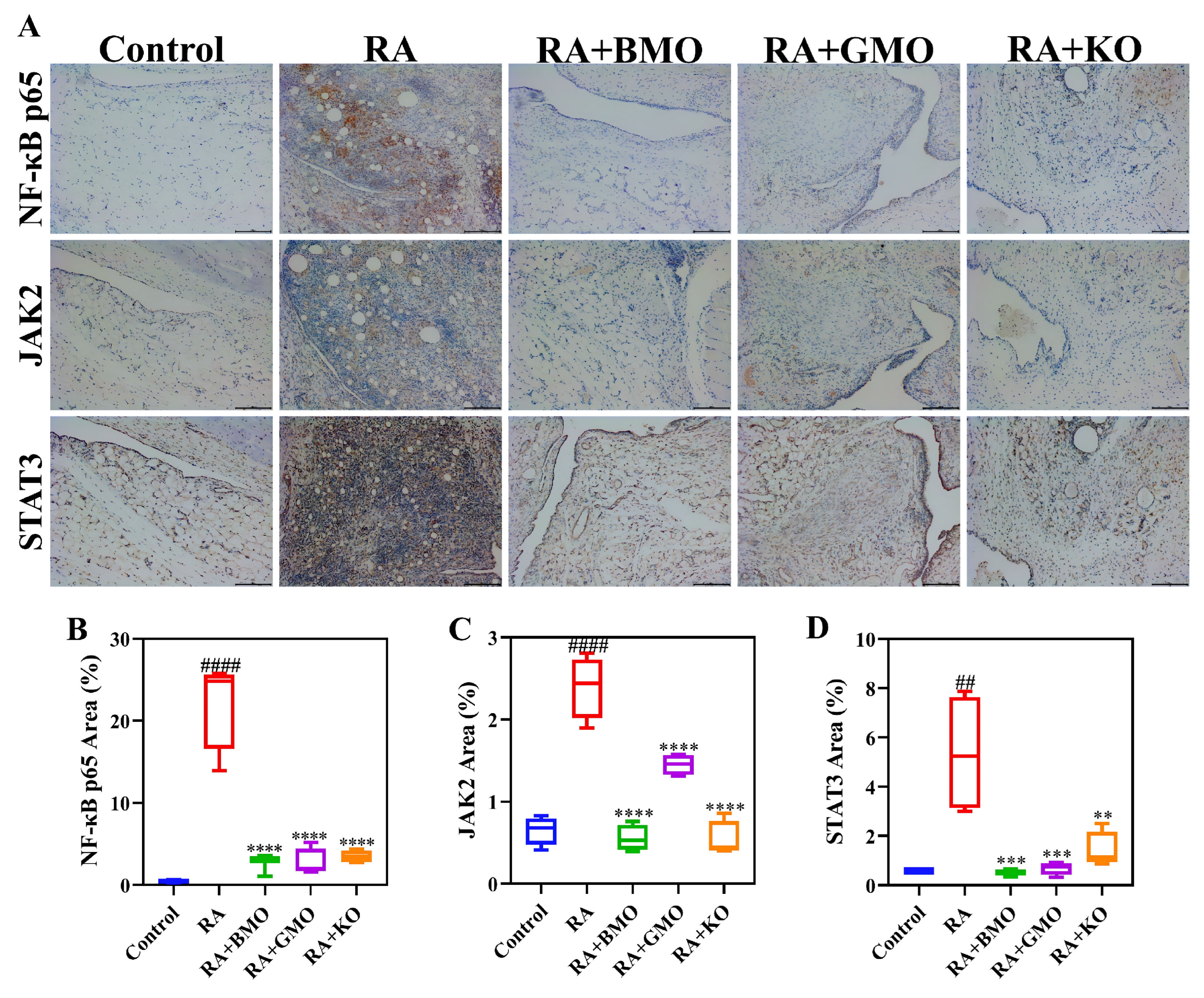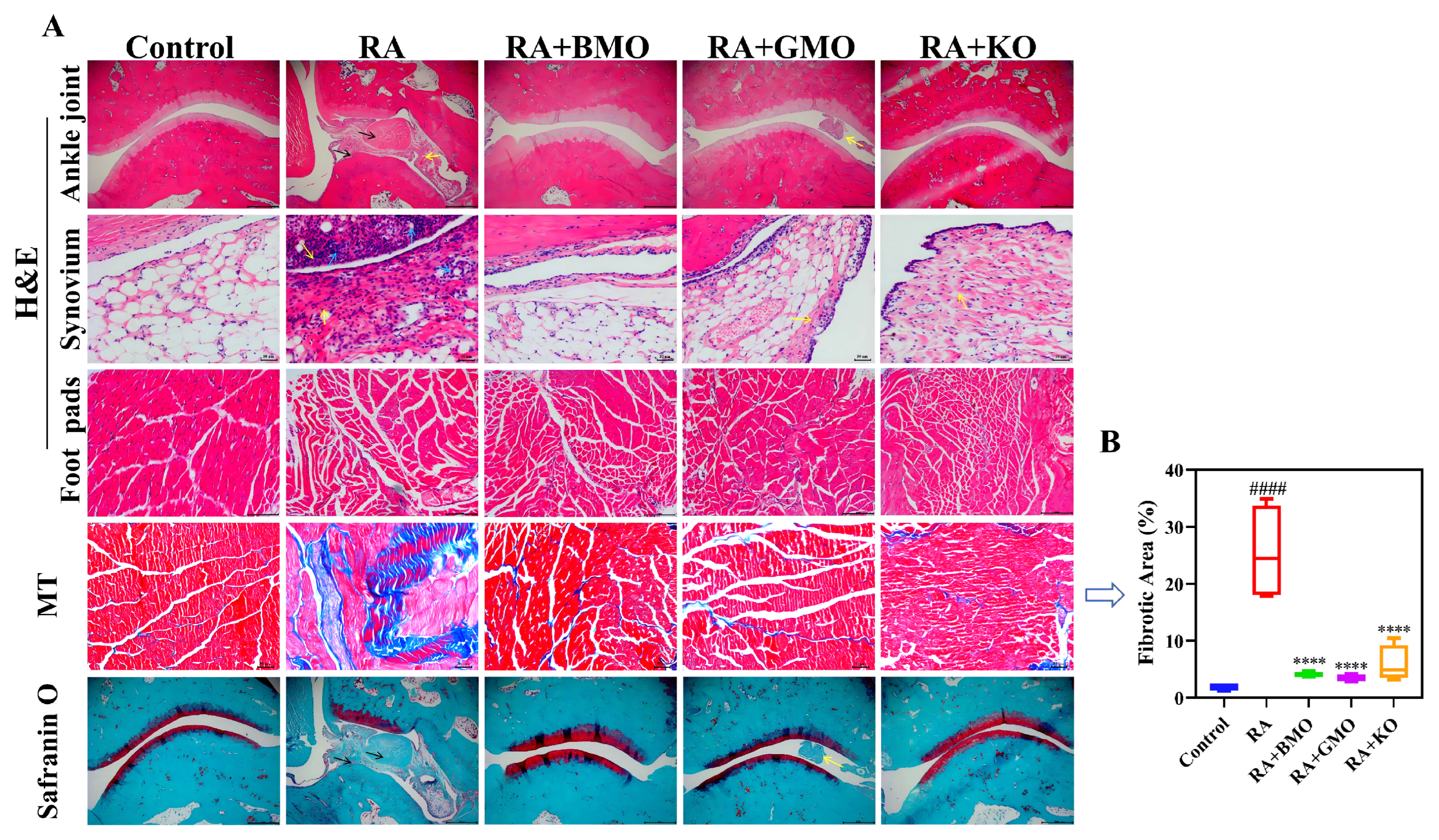 : On day 15, Control group was injected with normal saline; RA, RA + BMO, RA + GMO, and RA + KO groups were injected with CFA for modeling.
