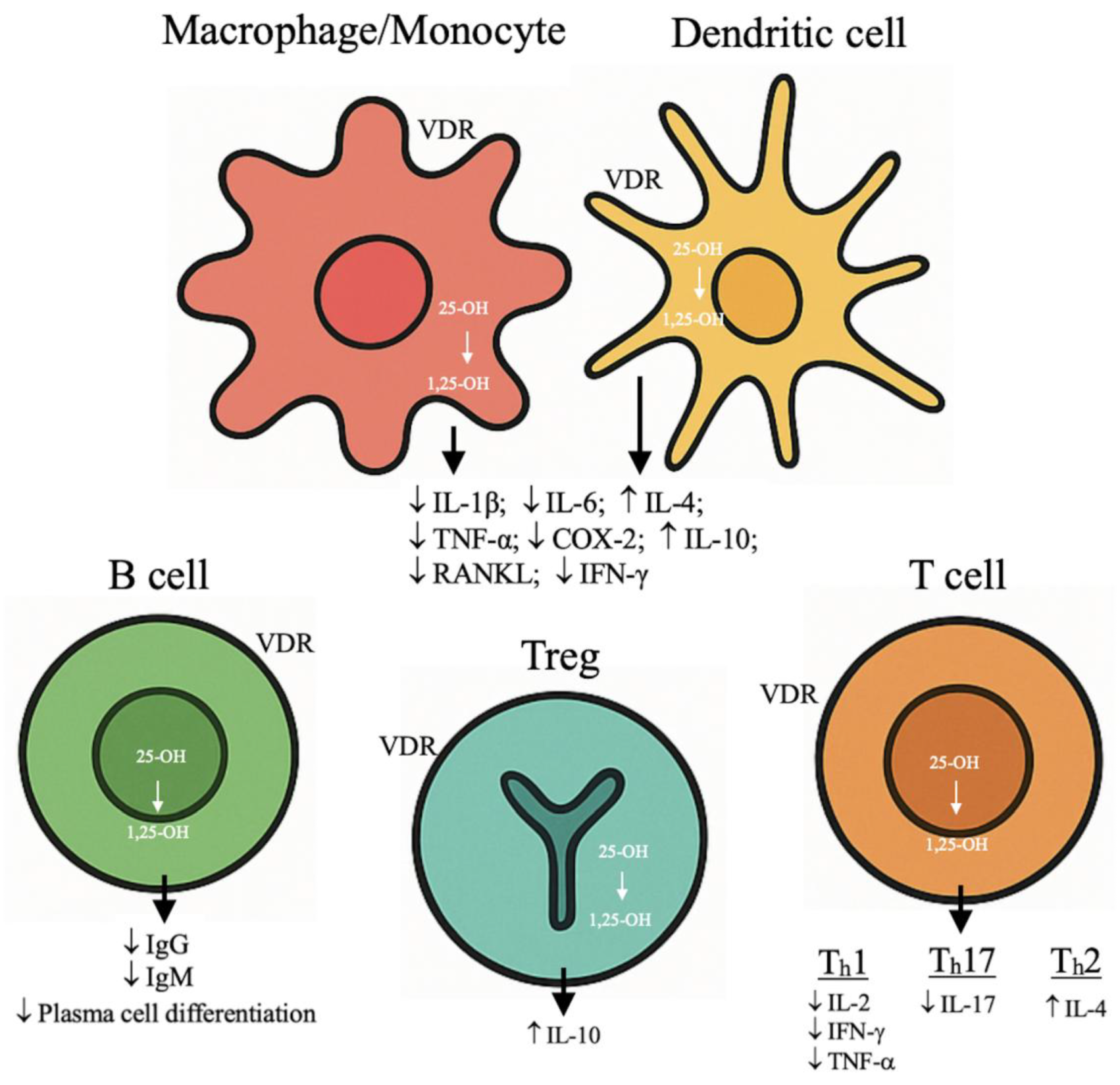 Figure 1. Immunomodulatory Effects of Vitamin D. This figure summarizes the proposed immunomodulatory actions of vitamin D on innate and adaptive immune cells, including effects on dendritic cells, macrophages, T lymphocyte subsets, and B cells. These mechanisms are supported by experimental and translational evidence; however, the direction and magnitude of these effects are context dependent and influenced by baseline vitamin D status, immune activation state, and experimental conditions. The pathways illustrated should not be interpreted as definitive causal relationships in clinical settings. VDR: Vitamin D Receptor. ↑ Increase; ↓ decrease.