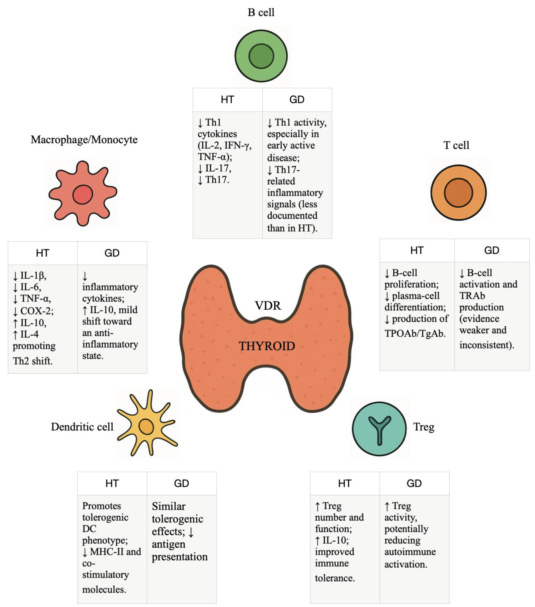 Figure 2. Immunological Actions of Vitamin D in Autoimmune Thyroid Diseases. This figure illustrates proposed interactions between vitamin D-mediated immune modulation and autoimmune thyroid diseases, with particular reference to Hashimoto’s thyroiditis and Graves’ disease. The depicted associations are derived from observational and interventional studies and reflect heterogeneous findings across different disease stages, populations, and study designs. Consequently, these pathways should be interpreted as conceptual frameworks rather than as evidence of uniform or causal effects. VDR: Vitamin D Receptor; HT: Hashimoto’s Thyroiditis; GD: Graves’ Disease. ↑ Increase; ↓ decrease.
