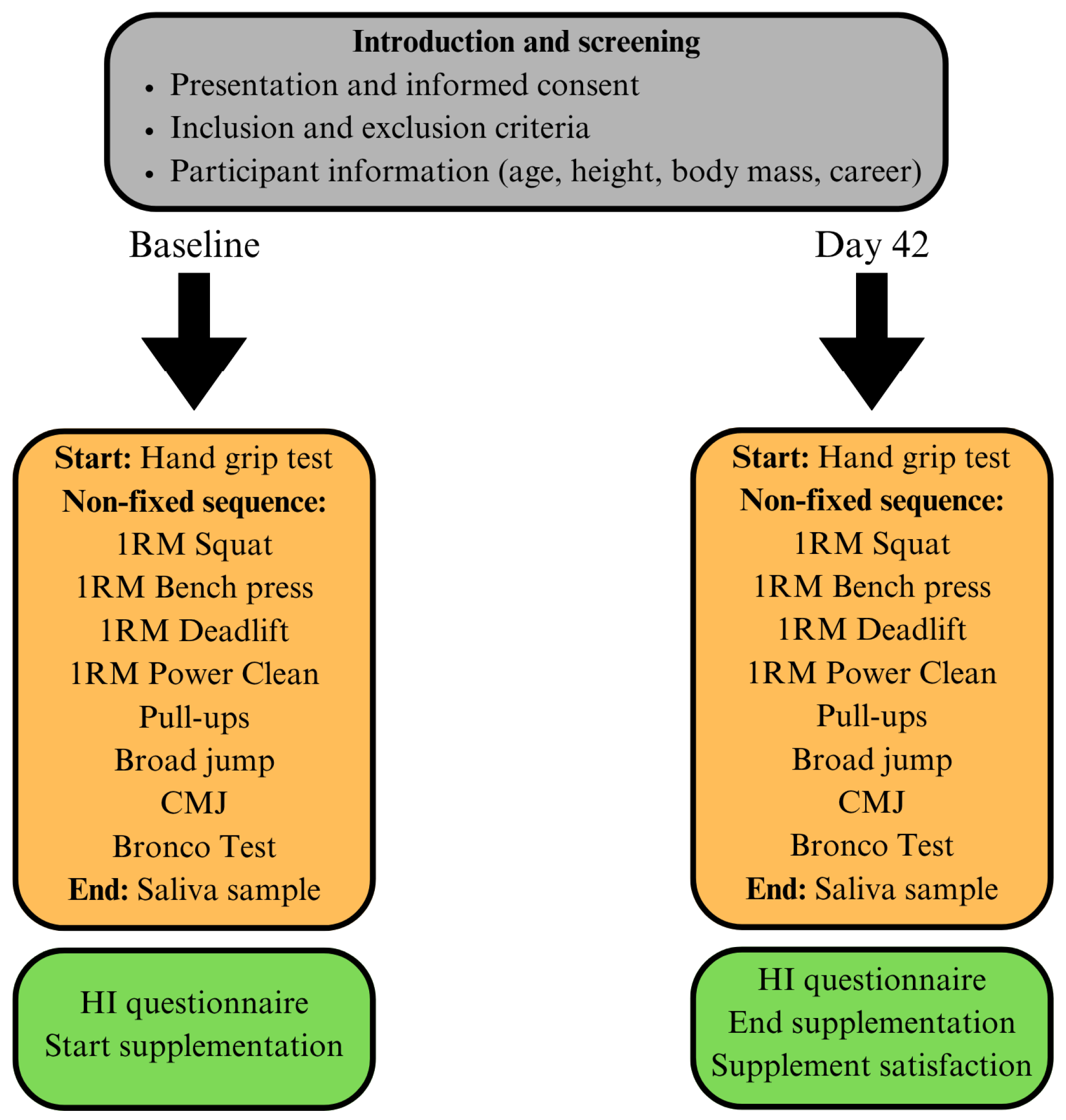 | CMJ (cm) | Baseline Day 42 | 34.57 (3.48) 36.21 (2.67) | 32.21 (1.85) 35.50 (4.88) | (33.67, 35.58) | 0.098 | 0.336 |