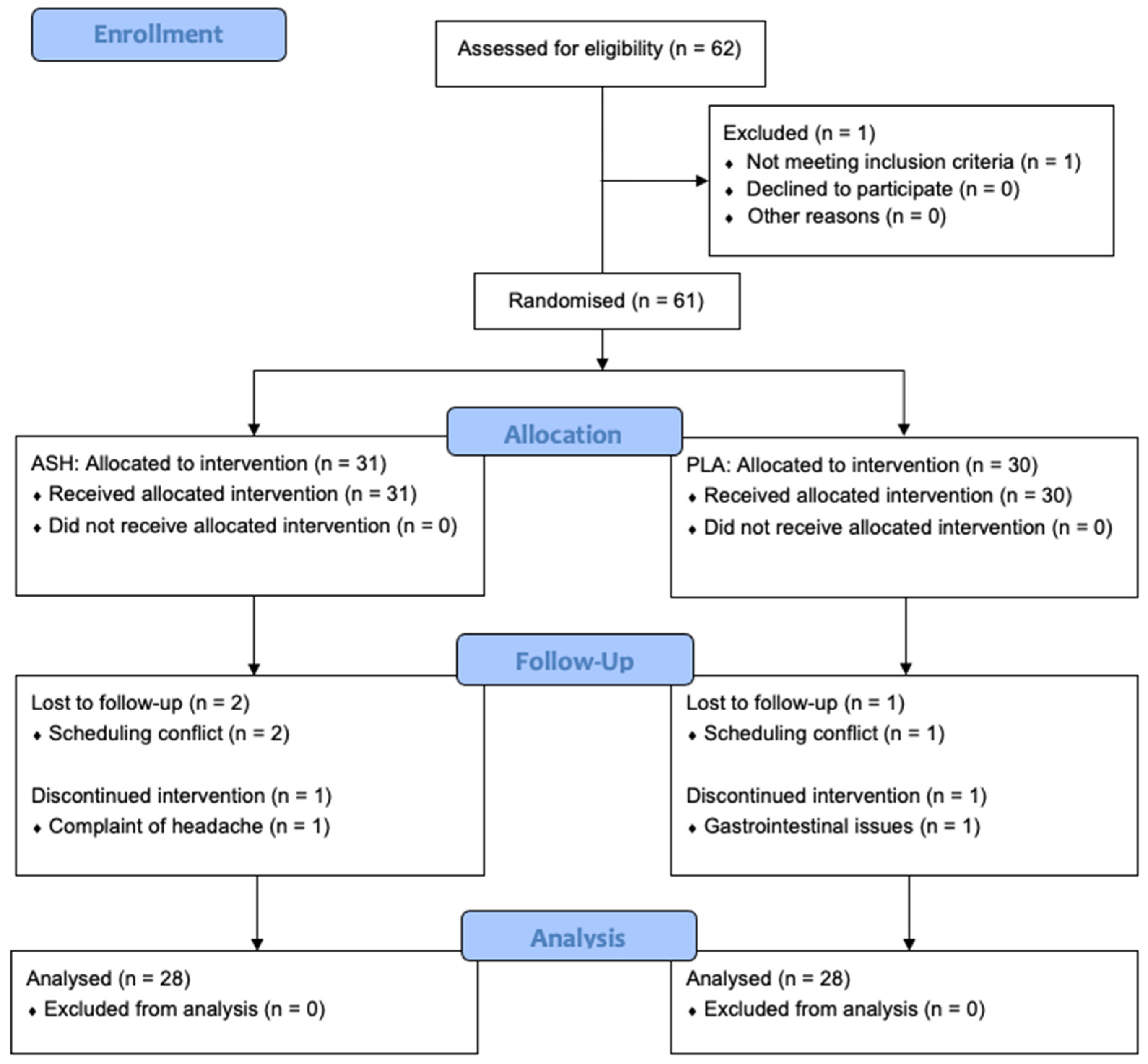 | ASH (n = 28) | PLA (n = 28) | p-Value | Female (n = 28) | Male (n = 28) | |